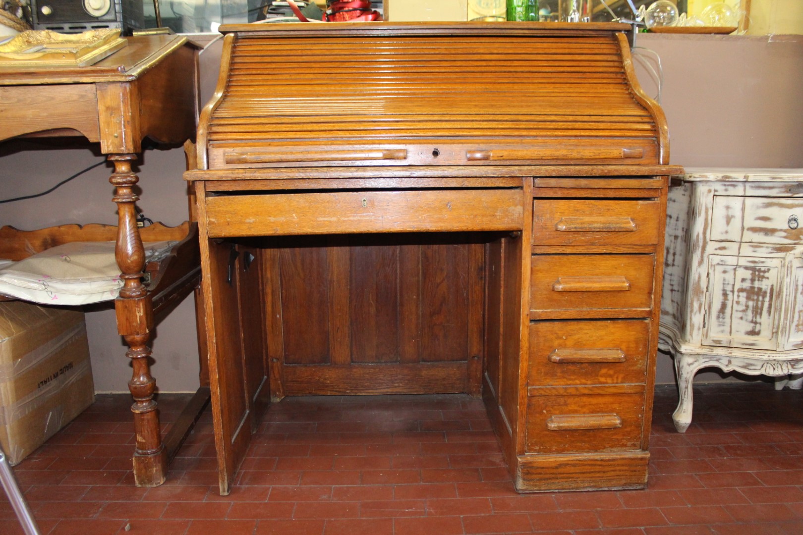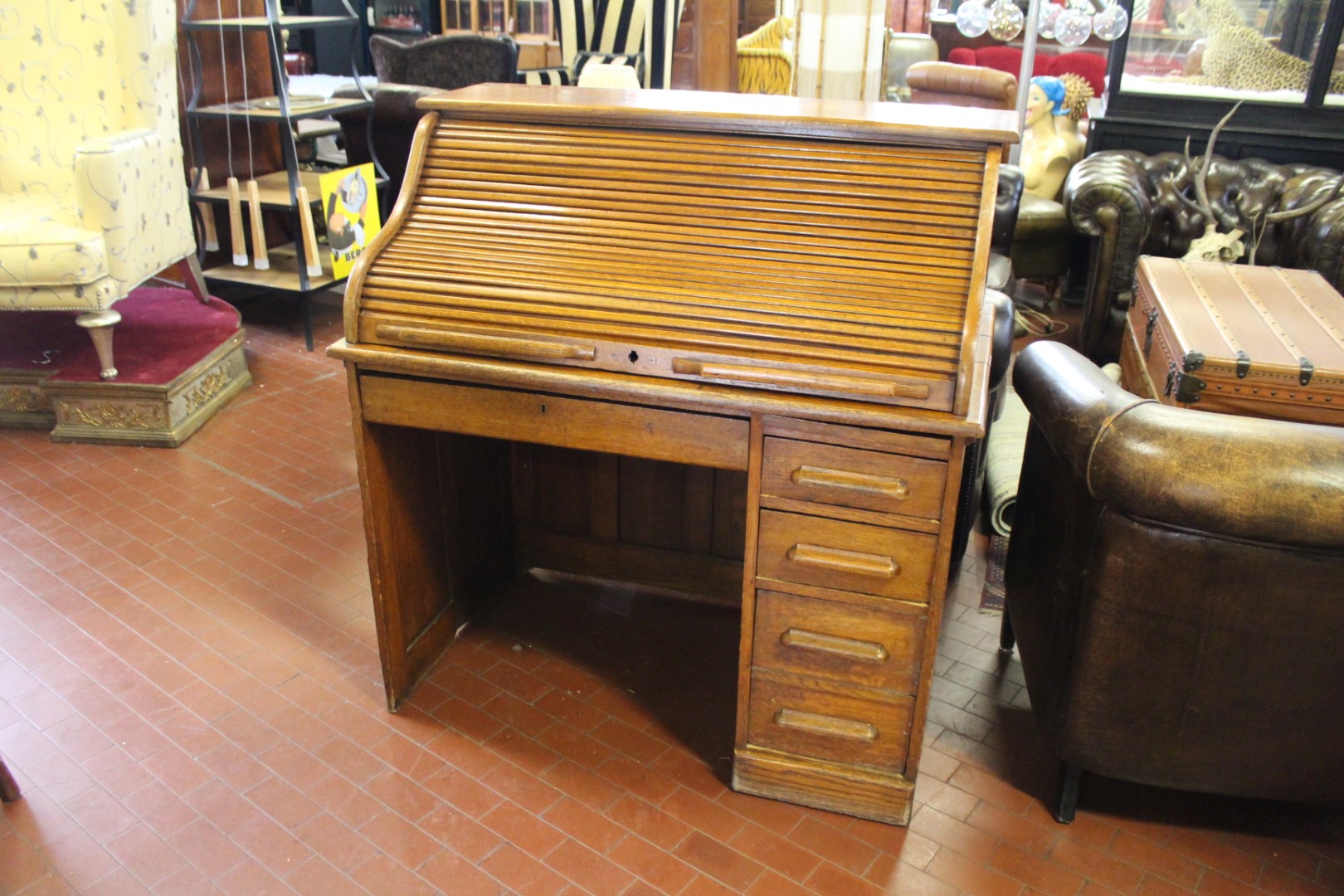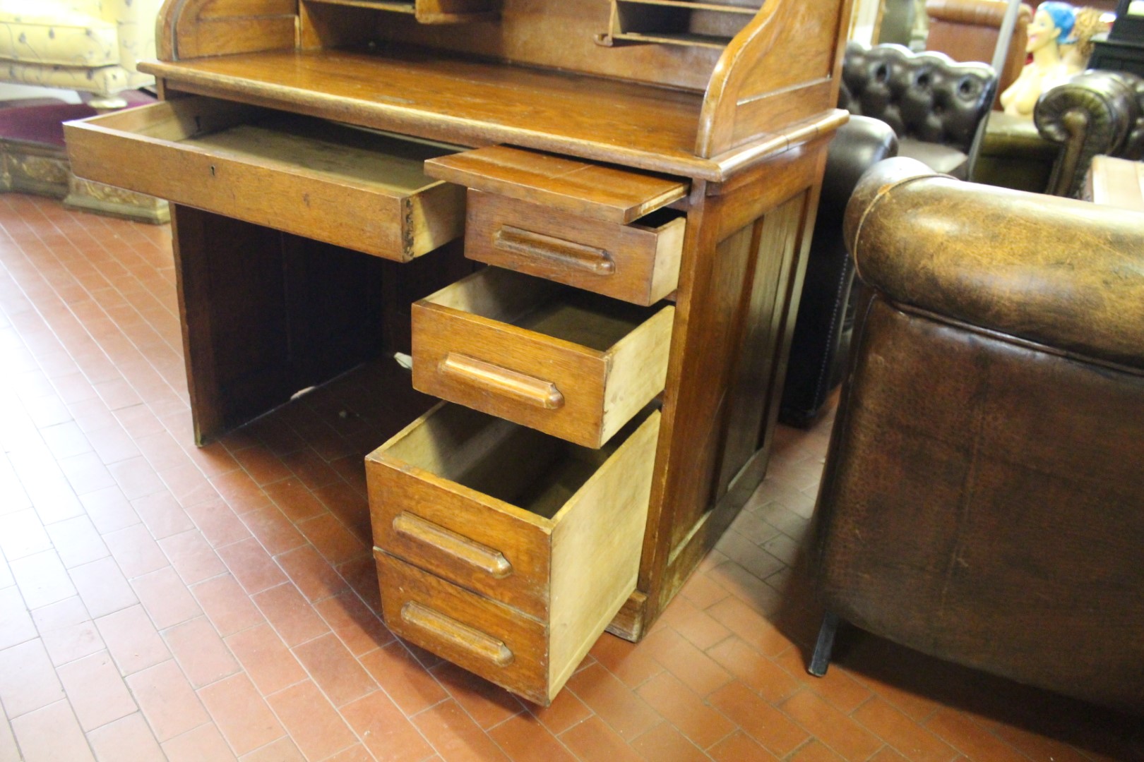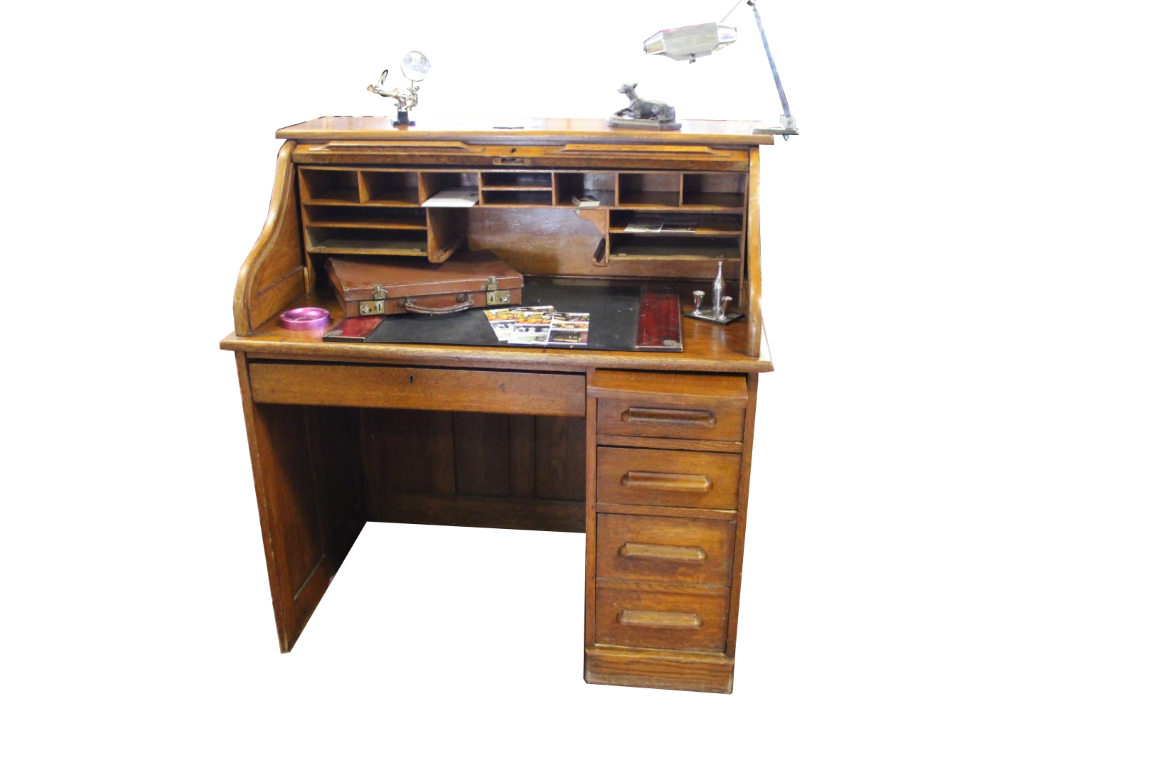 Scrivania roll top inglese in rovere, co una fila di cassetti ed un cassetto centrale. Originale anni '40