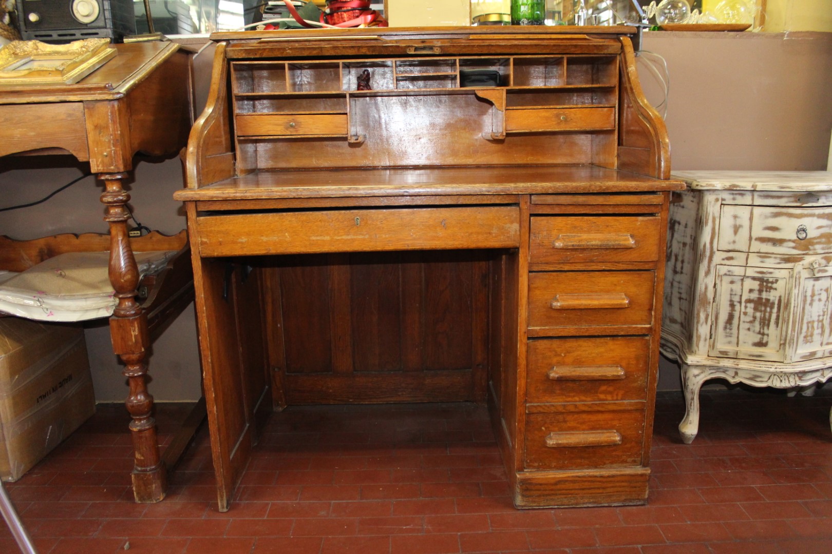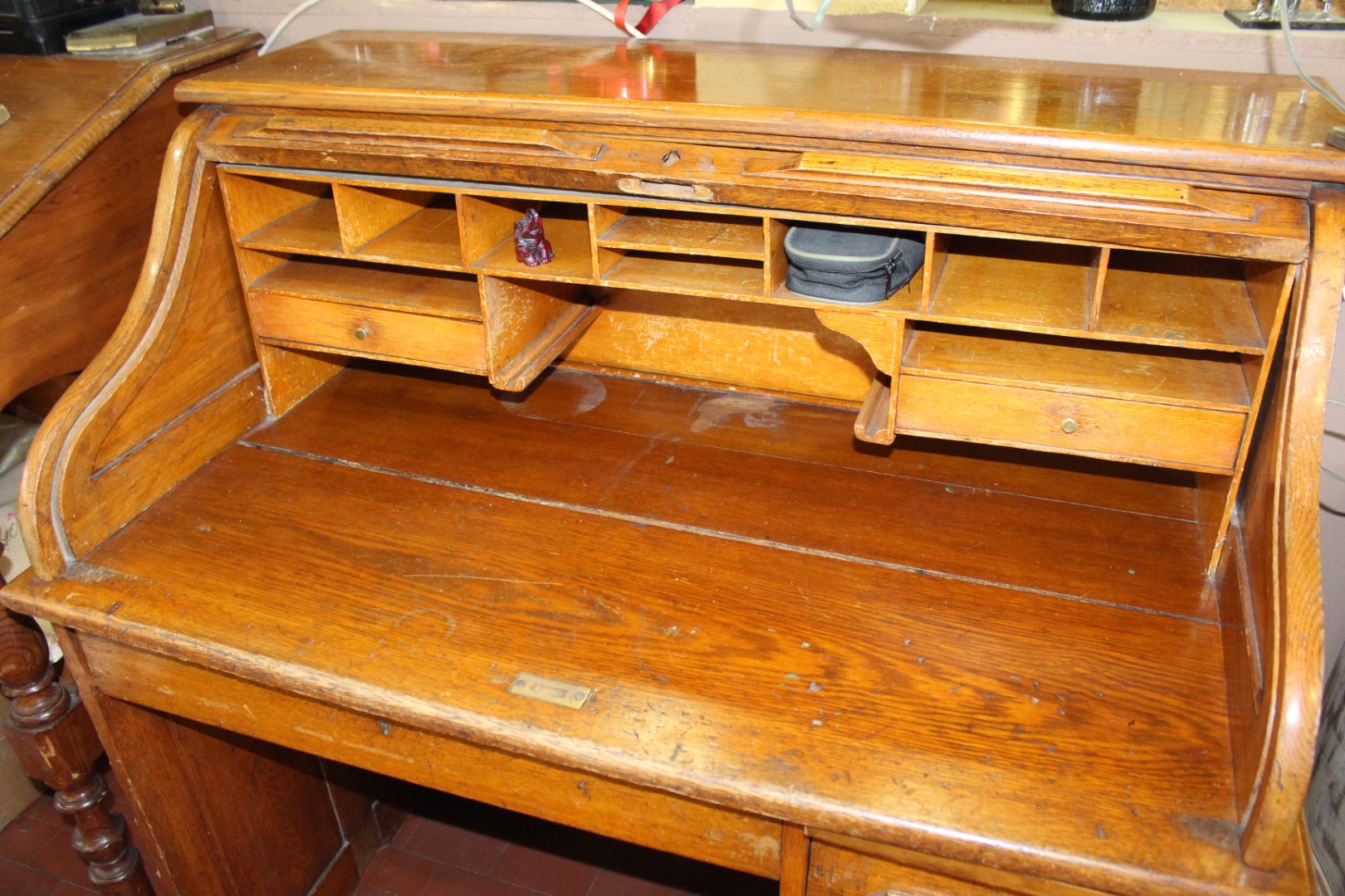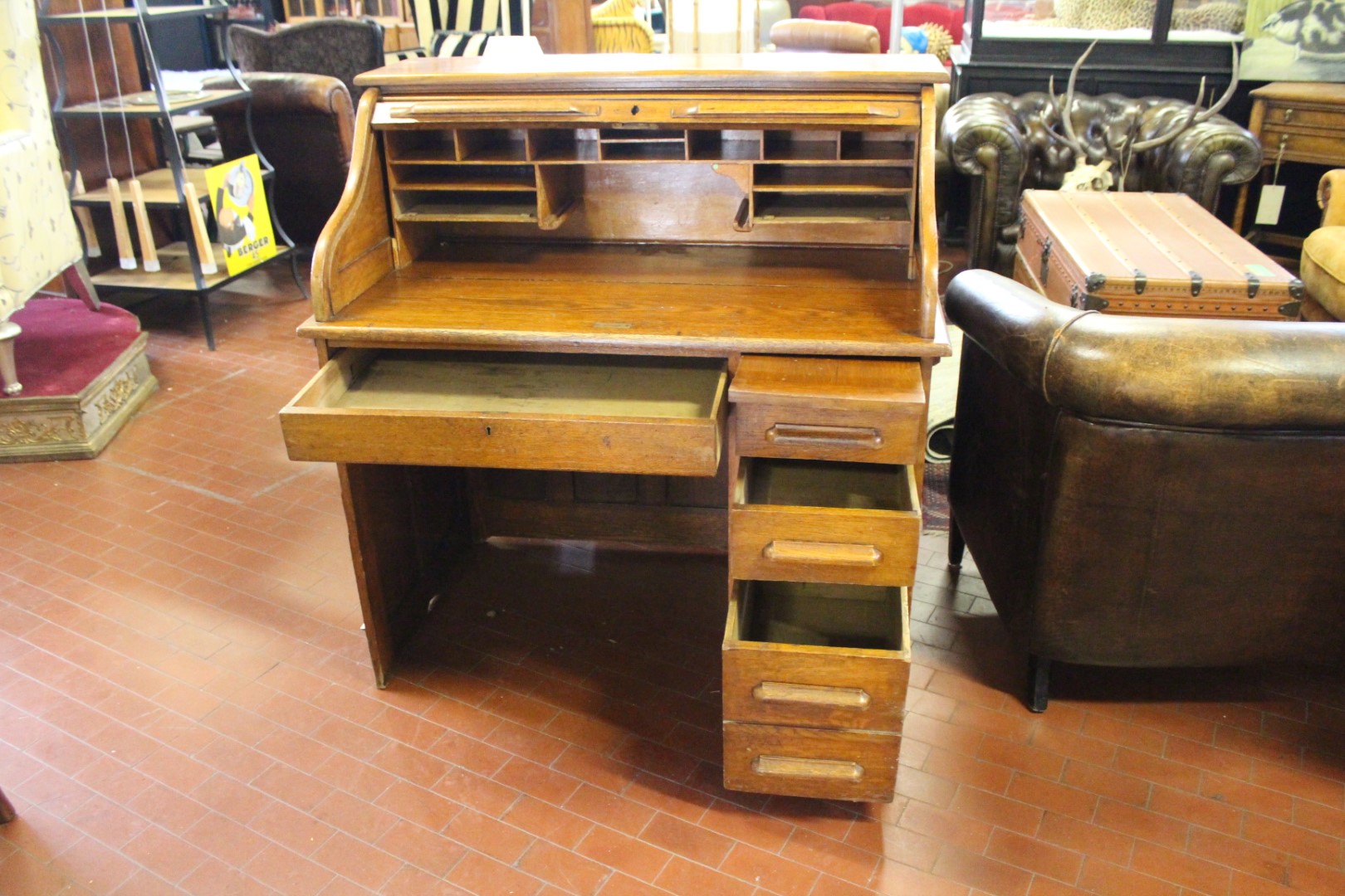 Scrivania roll top inglese in rovere, co una fila di cassetti ed un cassetto centrale. Originale anni '40