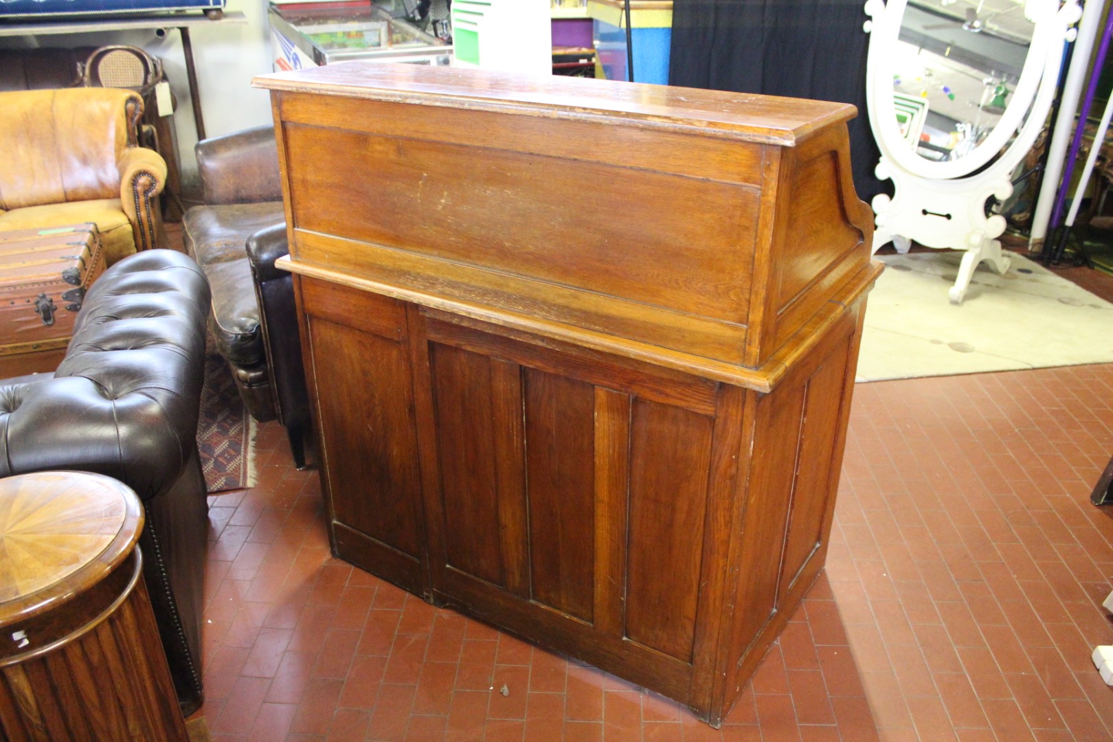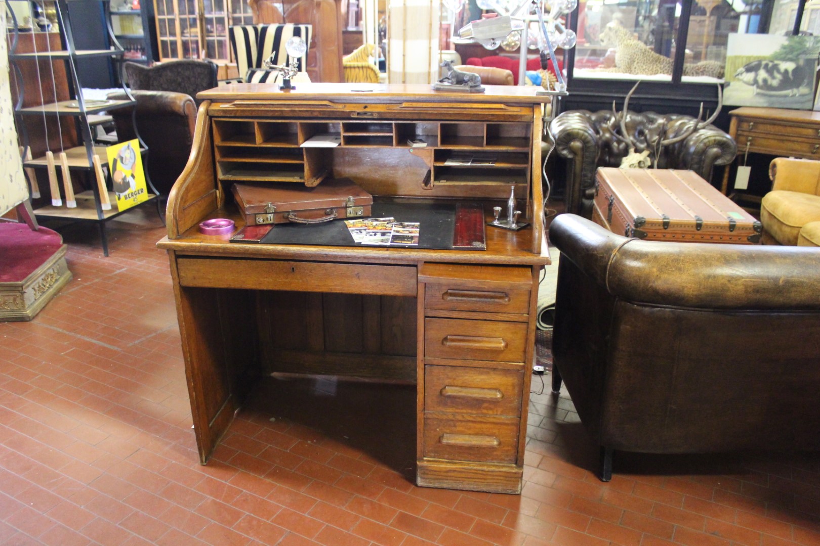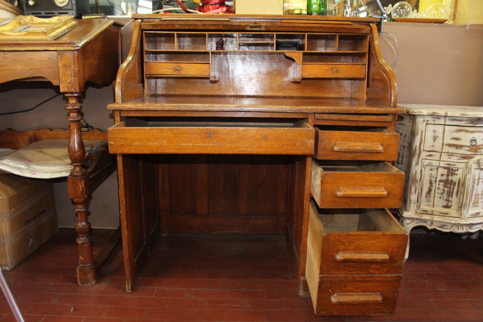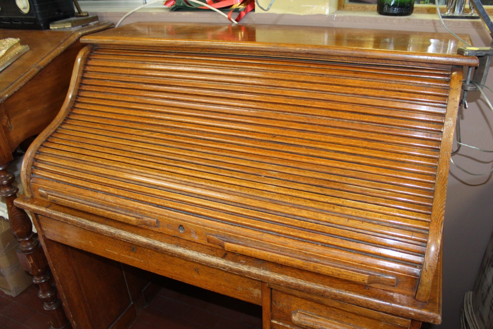 Scrivania roll top inglese in rovere, co una fila di cassetti ed un cassetto centrale. Originale anni '40