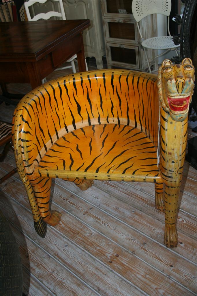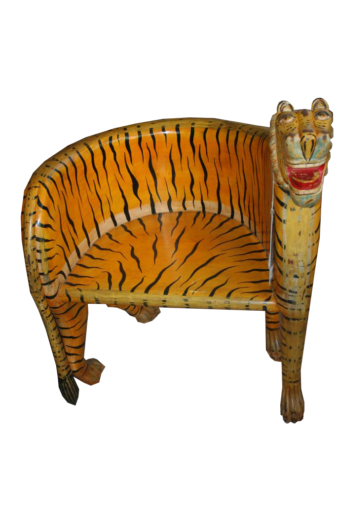 Coppia di poltrone in legno a foggia di tigre intagliate e dipinte a mano.