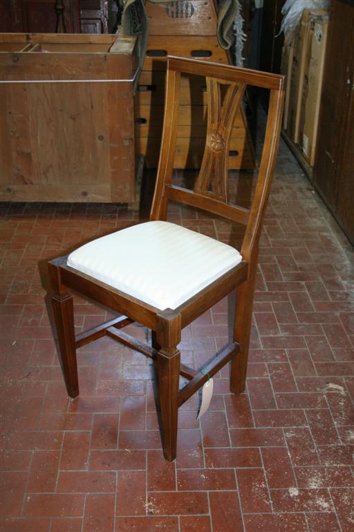 Sedia in legno in stile biedermeier, in legno di noce intarsiato, con imbottitura in stoffa bianca a righe.