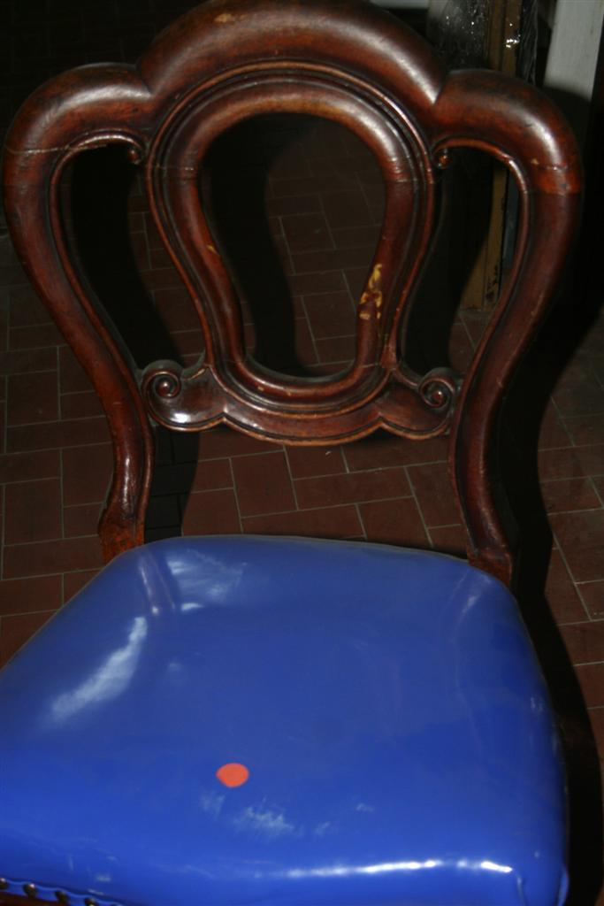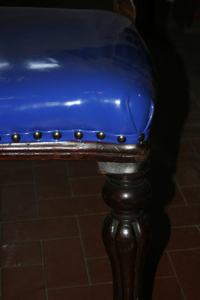 Sedia in stile in noce massello con seduta rivestita in vinile blu.