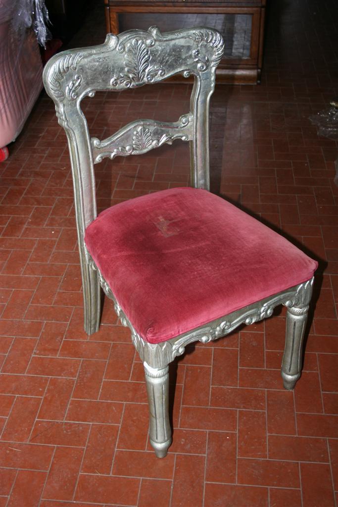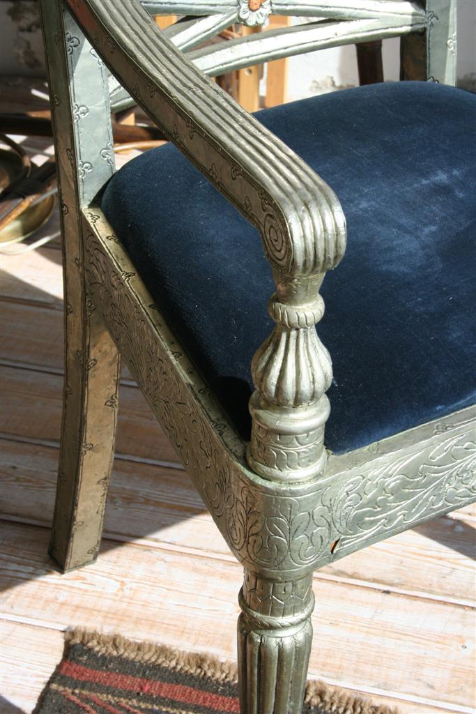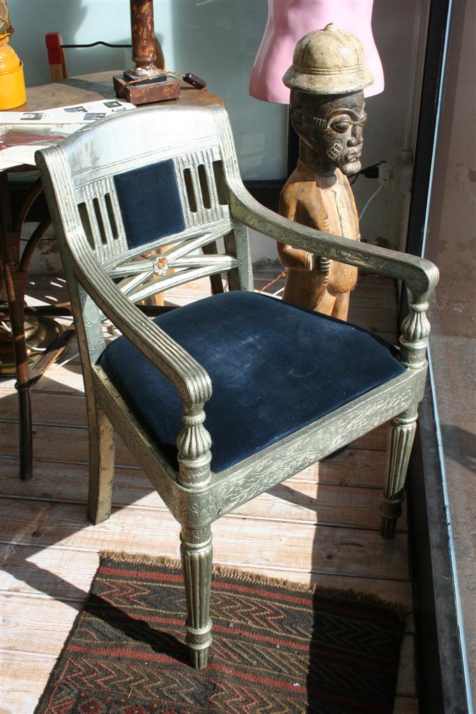 Sedia indonesiana rivestita in ottone ribattuto decorato.