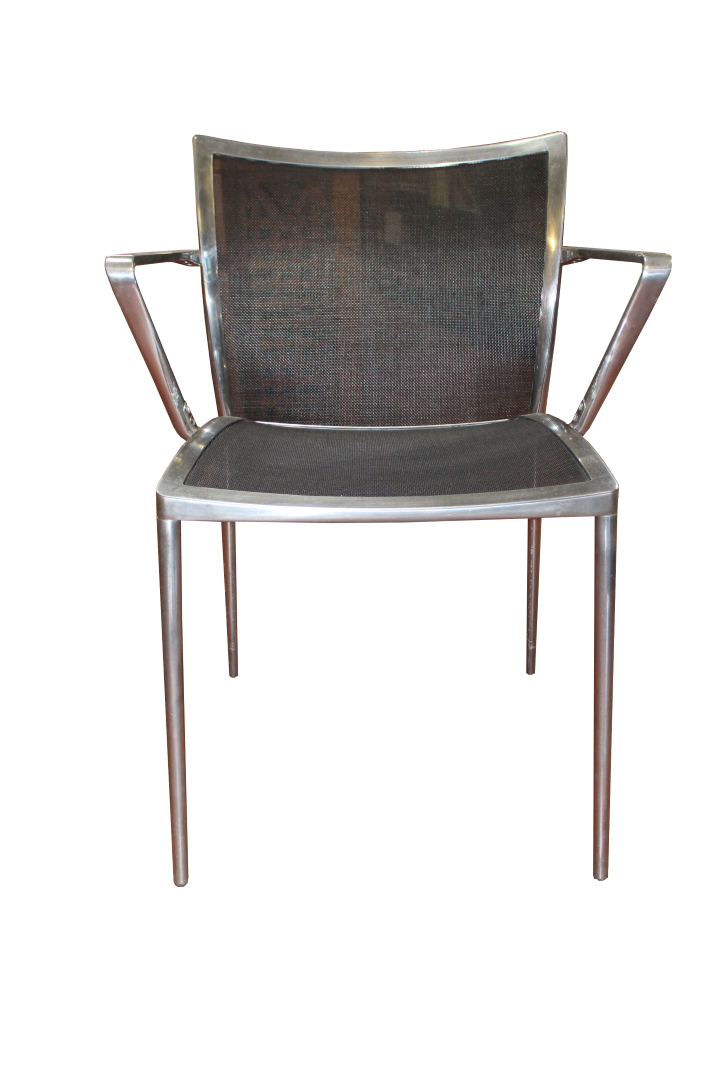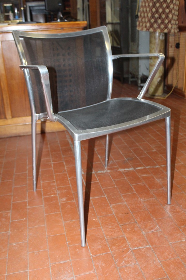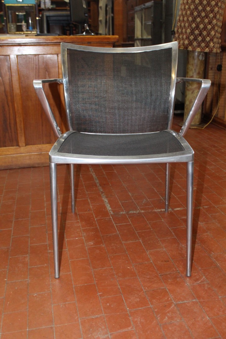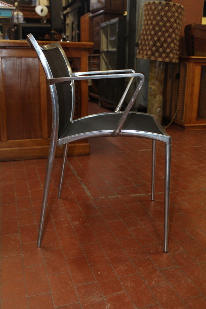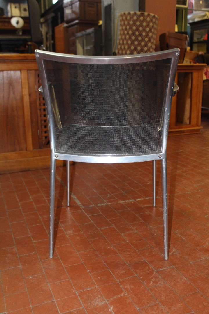 G&H Tatterton Best antique store Sedia con braccioli Zanotta anni '70 in alluminio con seduta in rete di vinile nera.