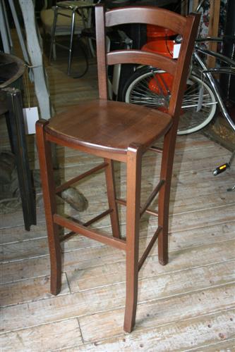 Sgabello da osteria rustico con schienale in legno di abete, color noce.