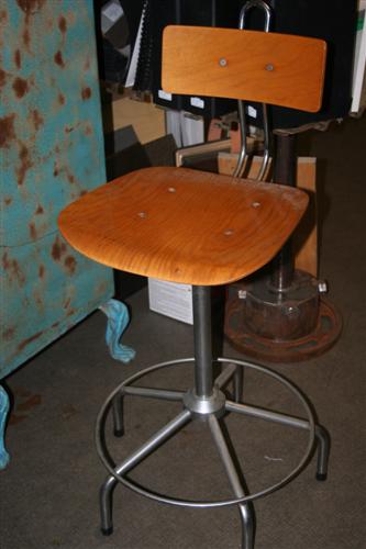 Sgabello da architetto girevole in legno, con struttra in acciaio cromato, anni '60.