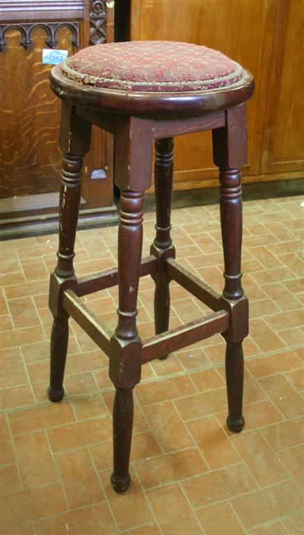 Sgabello inglese da pub alto in legno di quercia, con sedile imbottito.