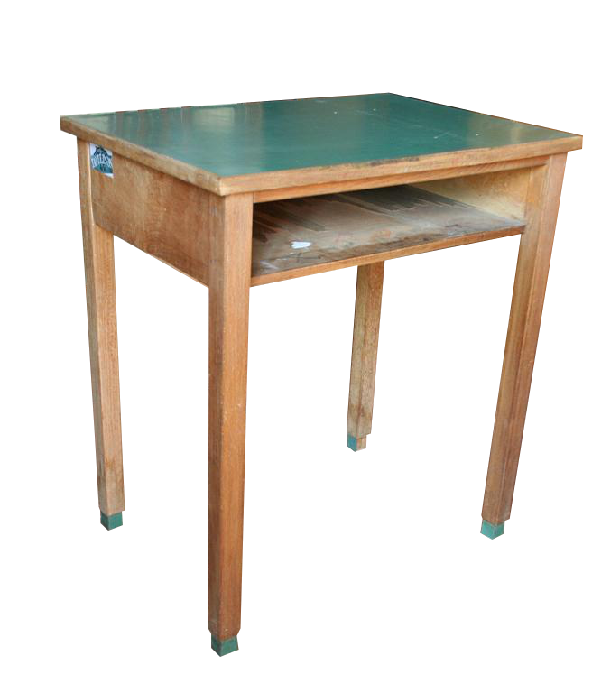 Banchetto da scuola anni '60, con piano in formica e ripiano poggialibri.