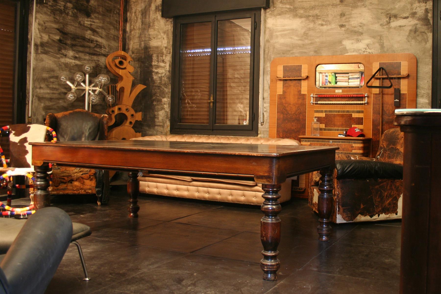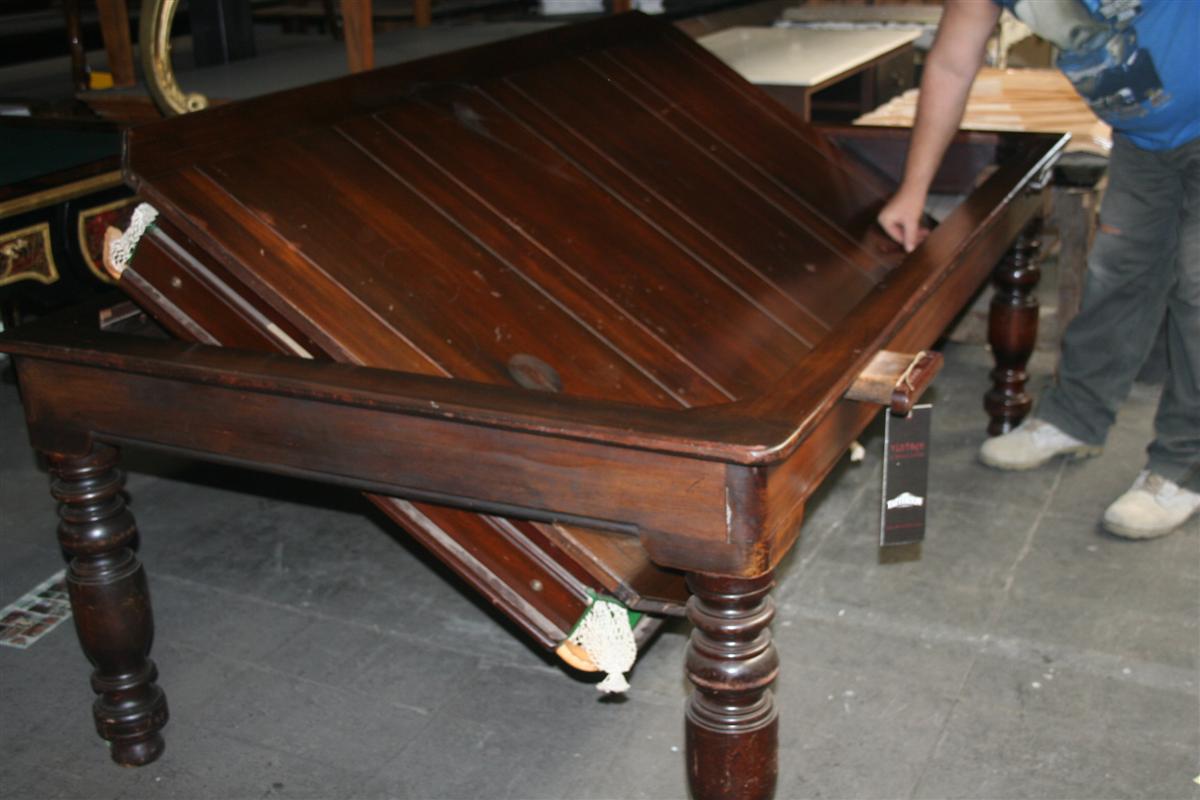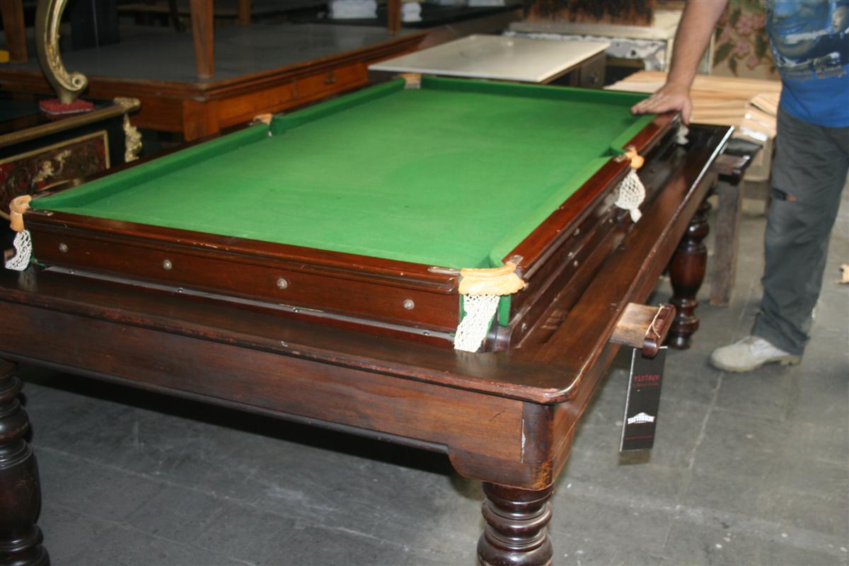 Il piano da gioco sottostante, in ardesia, è stato rivestito nuovamente con panno in stoffa da gioco di colore verde nuovo, le buche in ottone sono dotate di rete di raccolta in cotone.