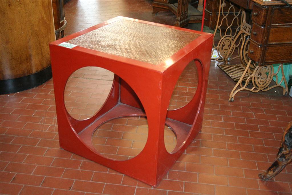 Tavolino etnico a cubo laccato rosso con piano in rattan, di provenienza orientale