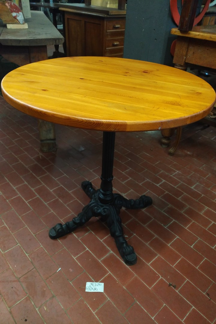 Tavolo da pub alto con piede in ghisa e piano in abete.