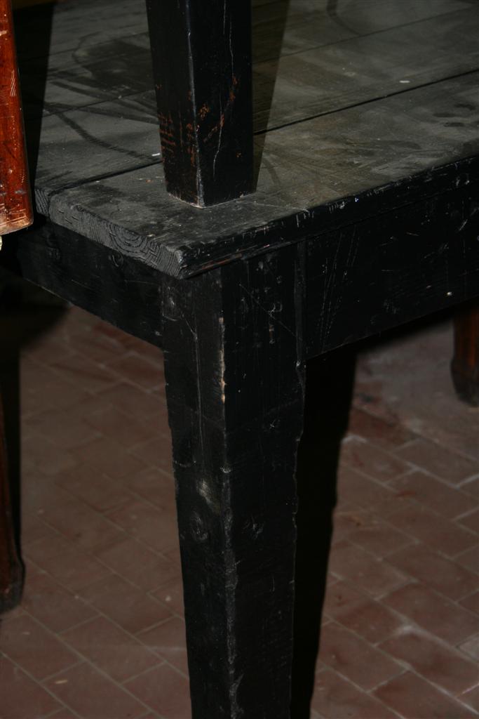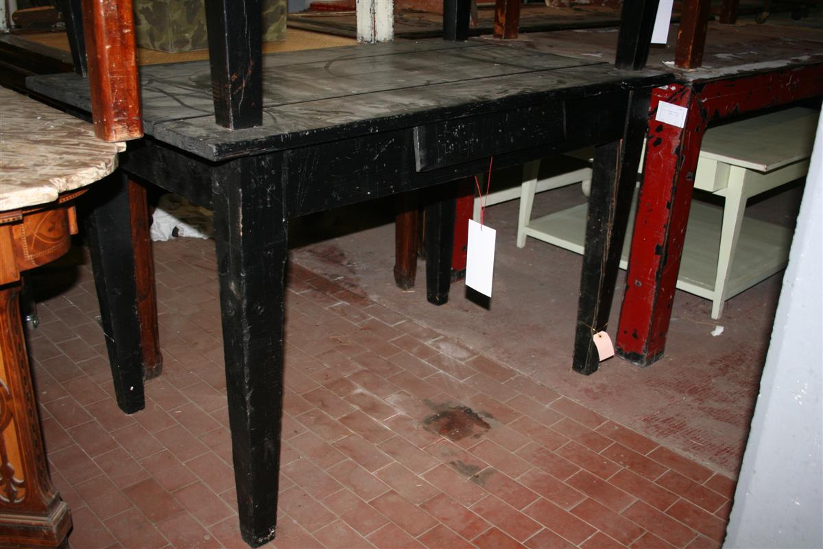 Tavolo rustico da lavoro con cassetto centrale, laccato nero, della prima metà del '900.