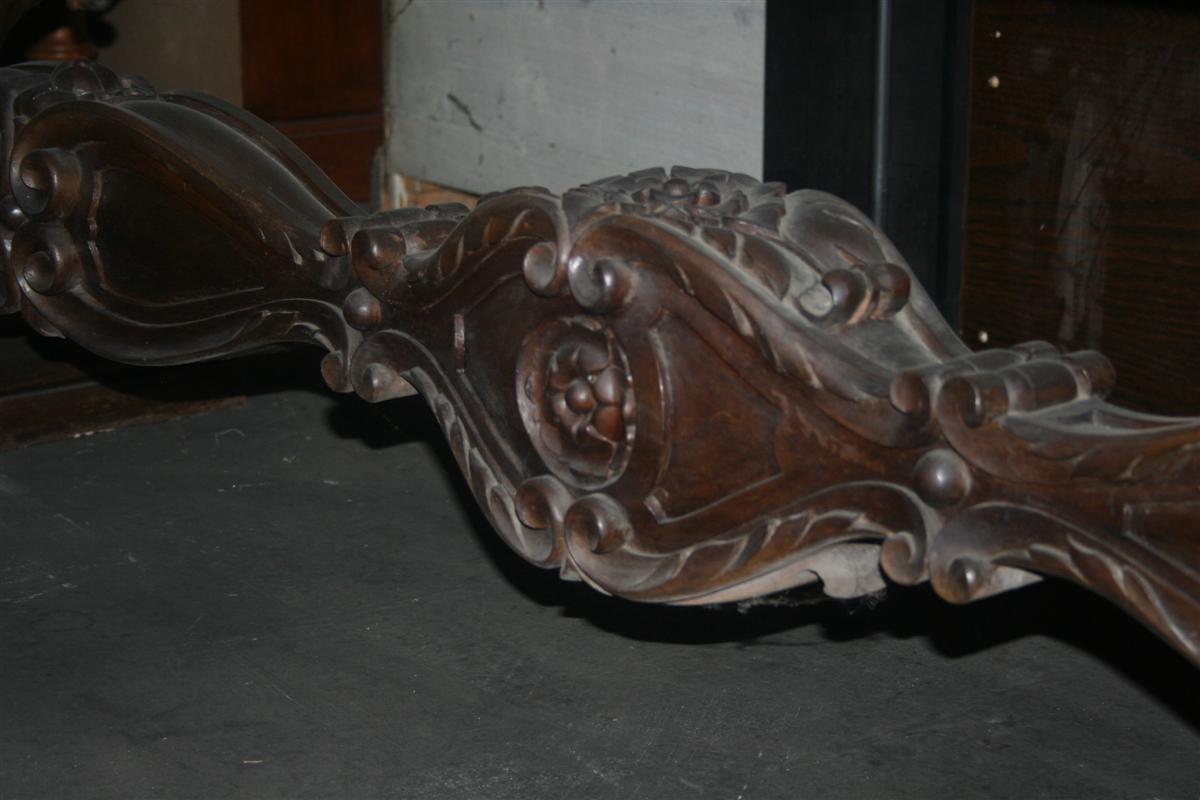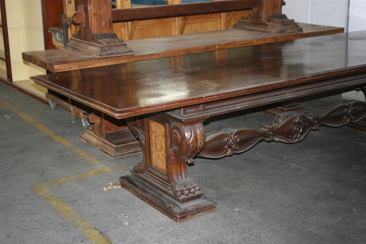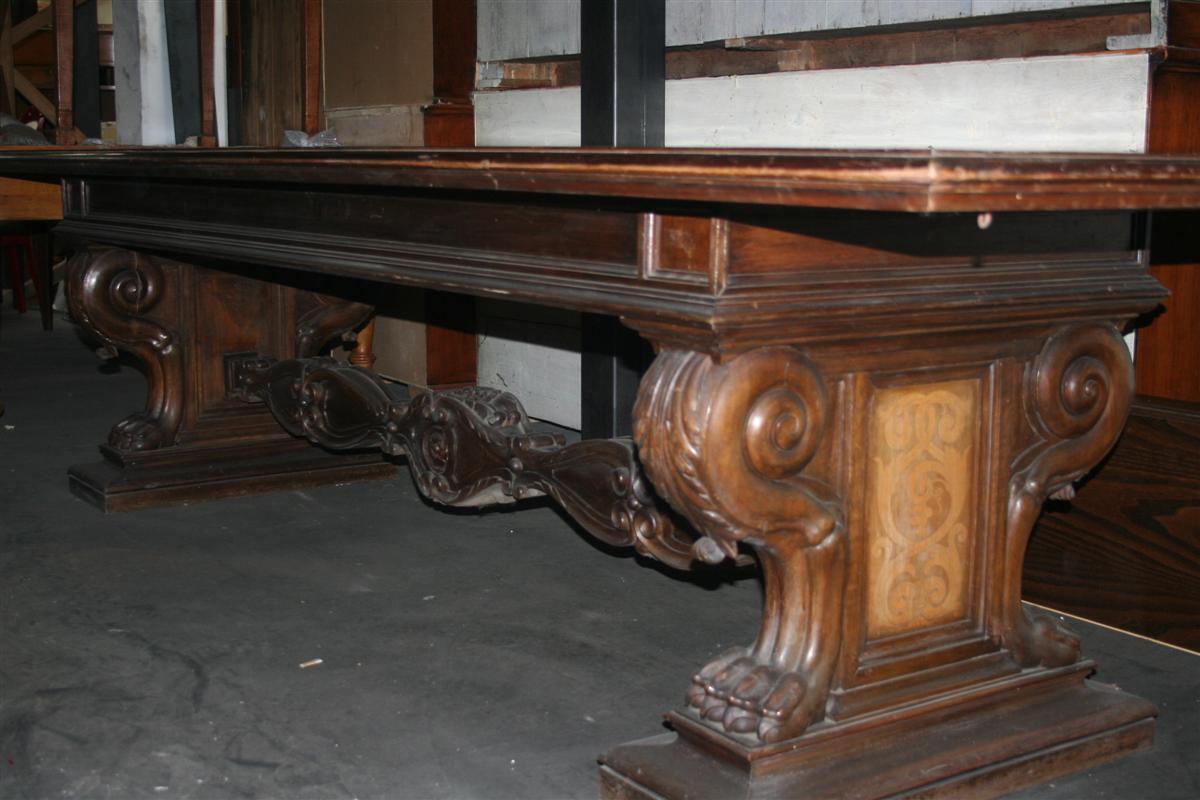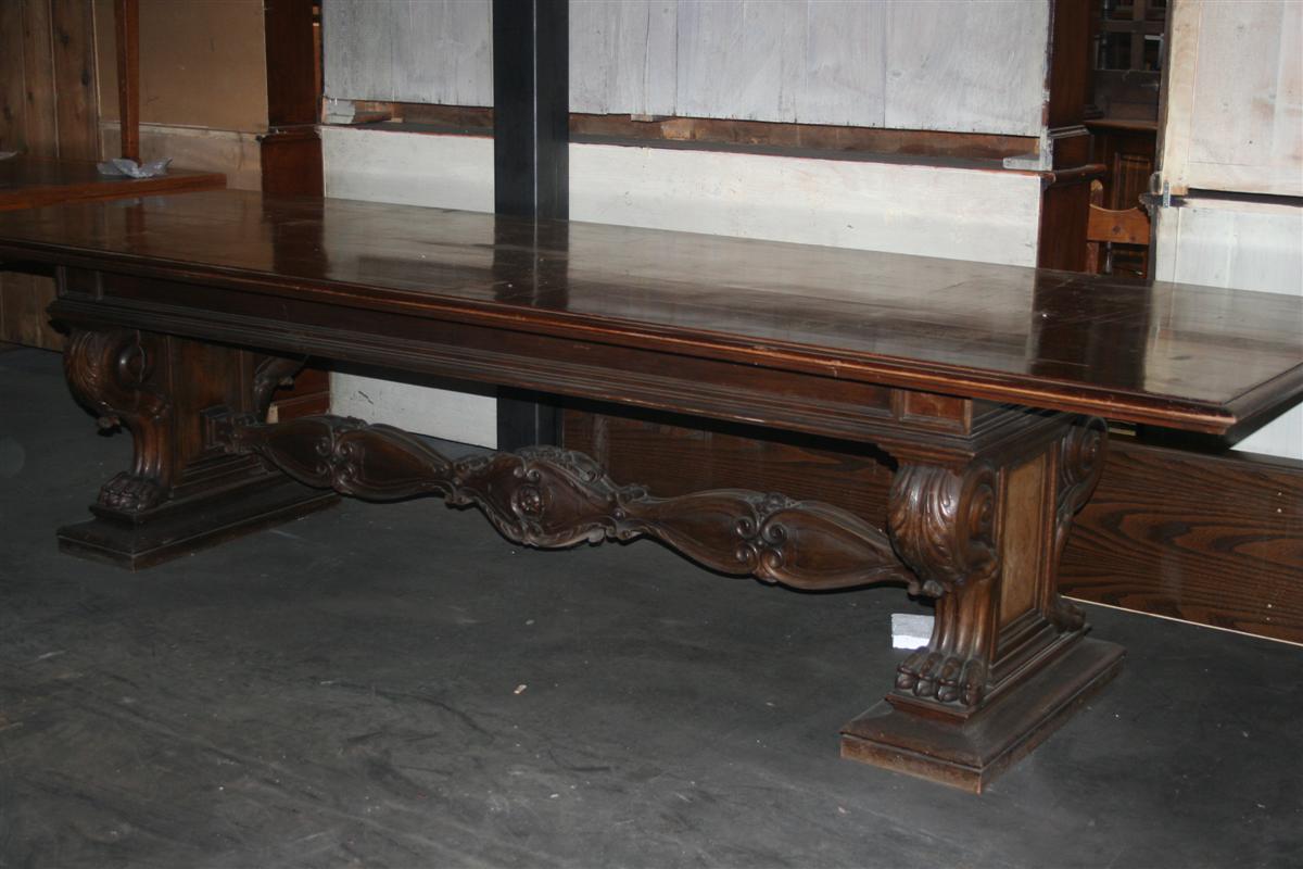 Tavolo in stile bolognese in noce, con intagli stile caccia, 16 posti.