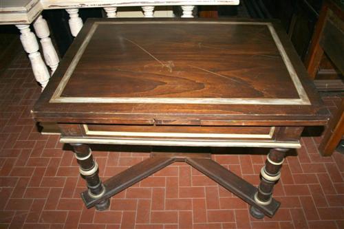 Tavolo rustico allungabile con gambe tornite decorato.