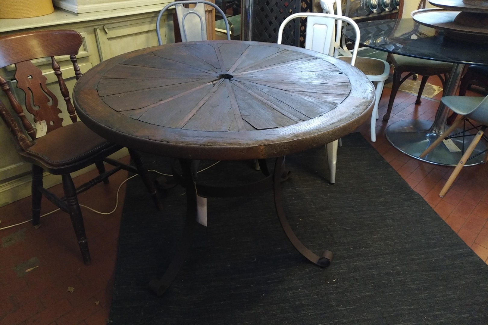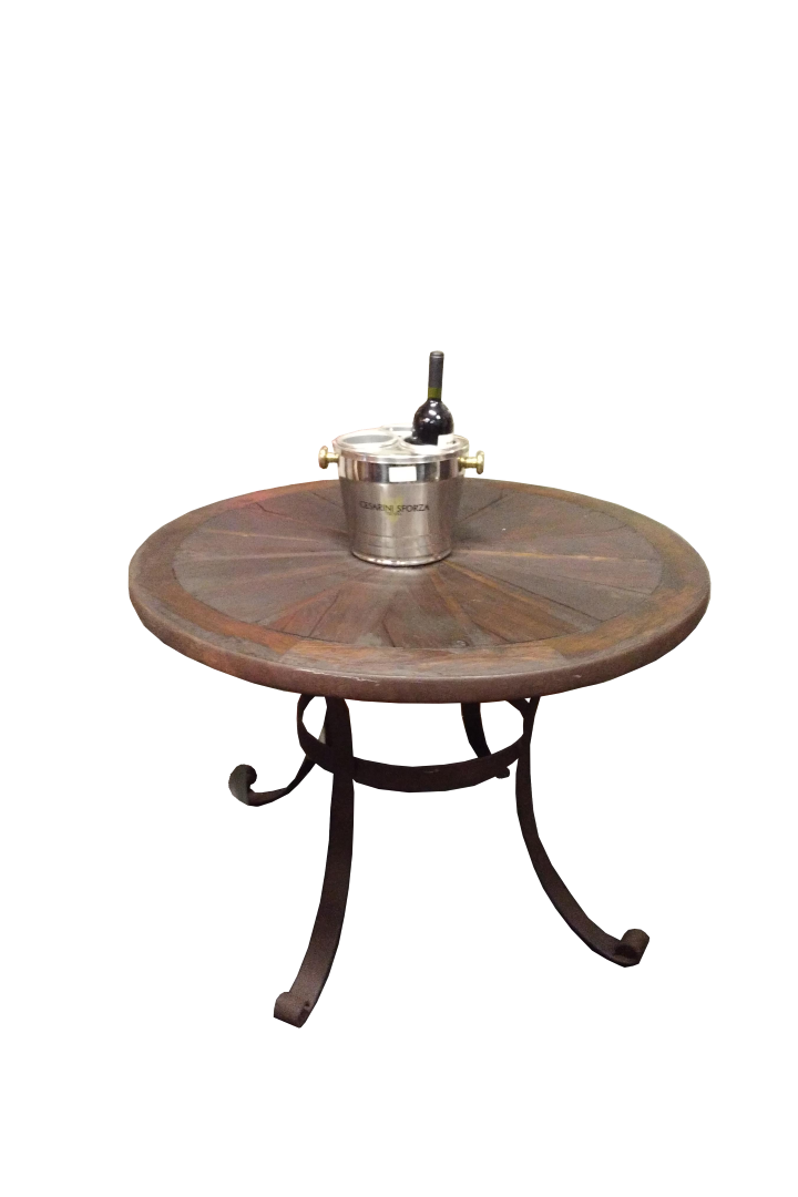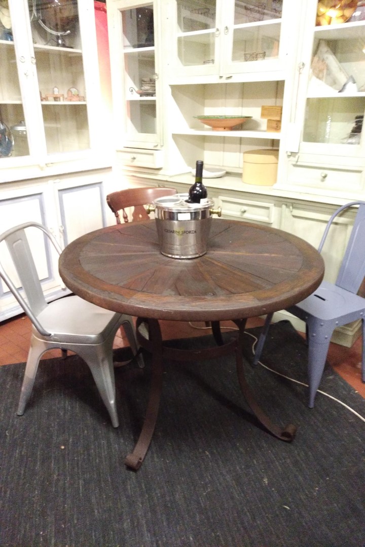 G&H Tatterton Best antique store Tavolo da pranzo creato con la vecchia ruota in legno da carro, opportunamente modificata. Il piano poggia su una base in ferro stile country western appositamente disegnata.