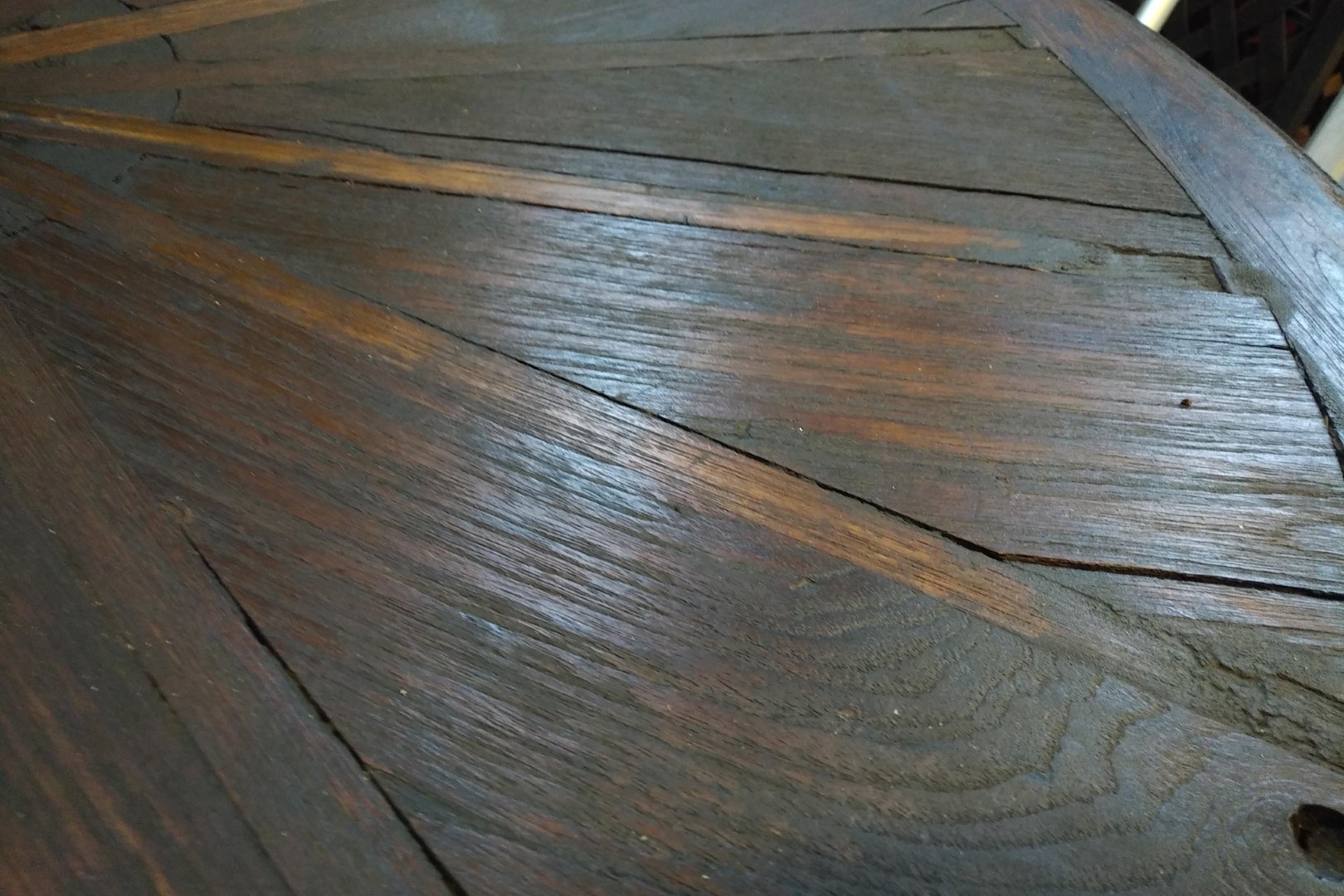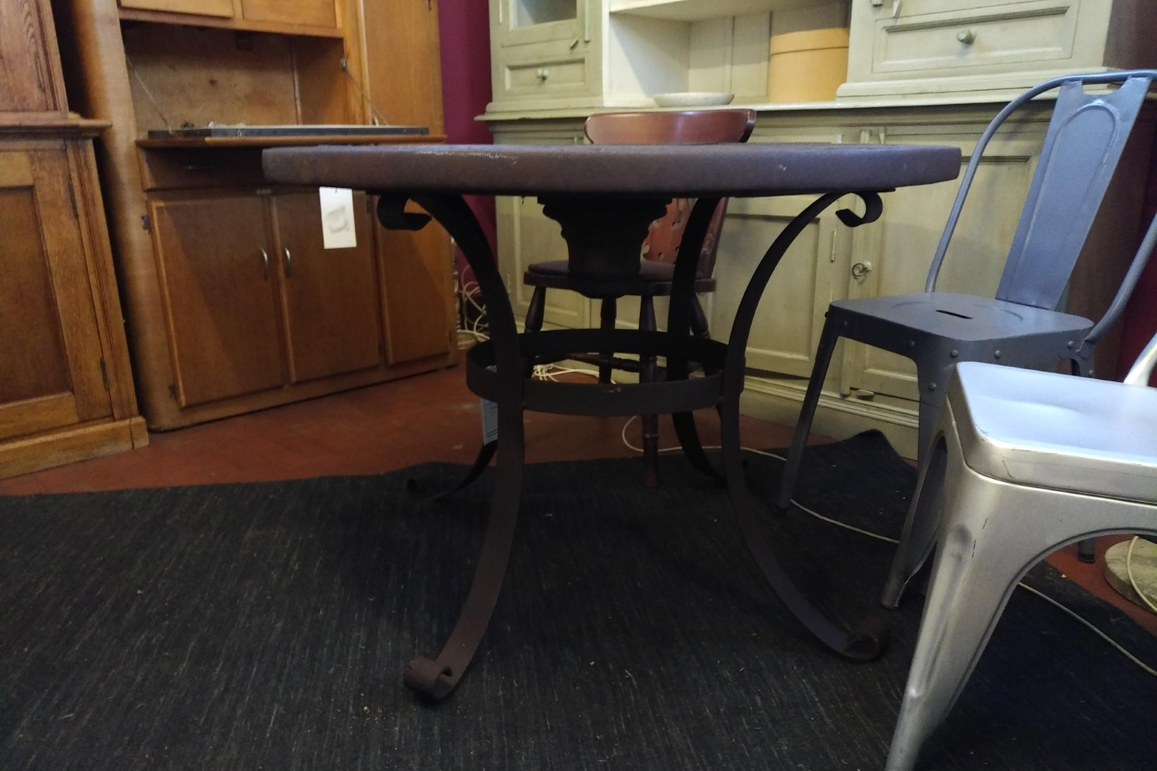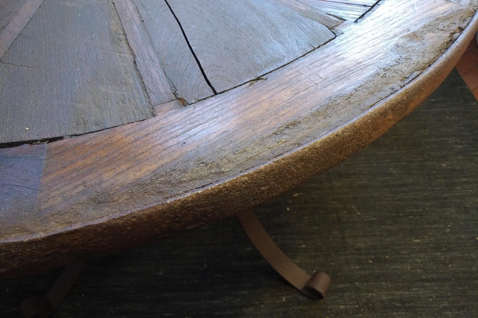 G&H Tatterton Best antique store Tavolo da pranzo creato con la vecchia ruota in legno da carro, opportunamente modificata. Il piano poggia su una base in ferro stile country western appositamente disegnata.
