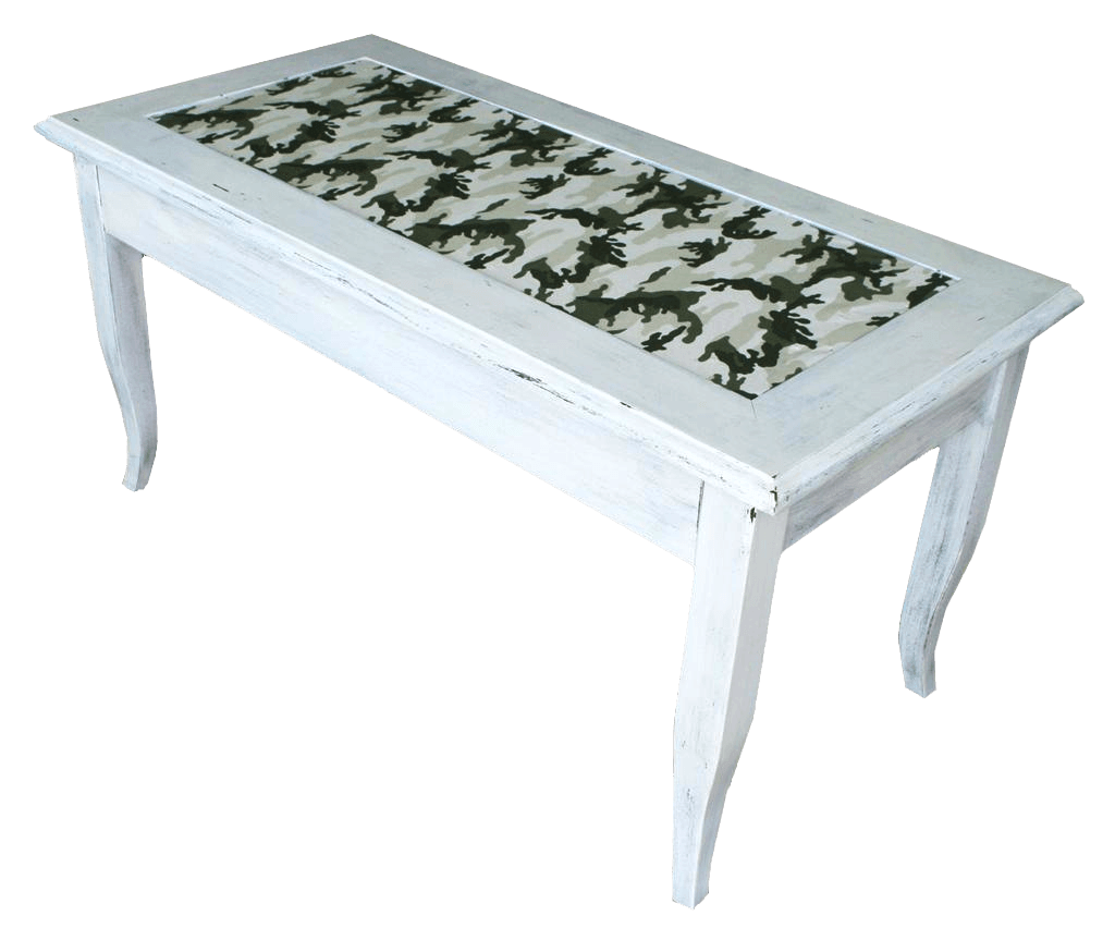 Disponibile bianco (con piano in cristallo o con piano rivestito in stoffa camouflage) oppure laccato oro con piano in cristallo.