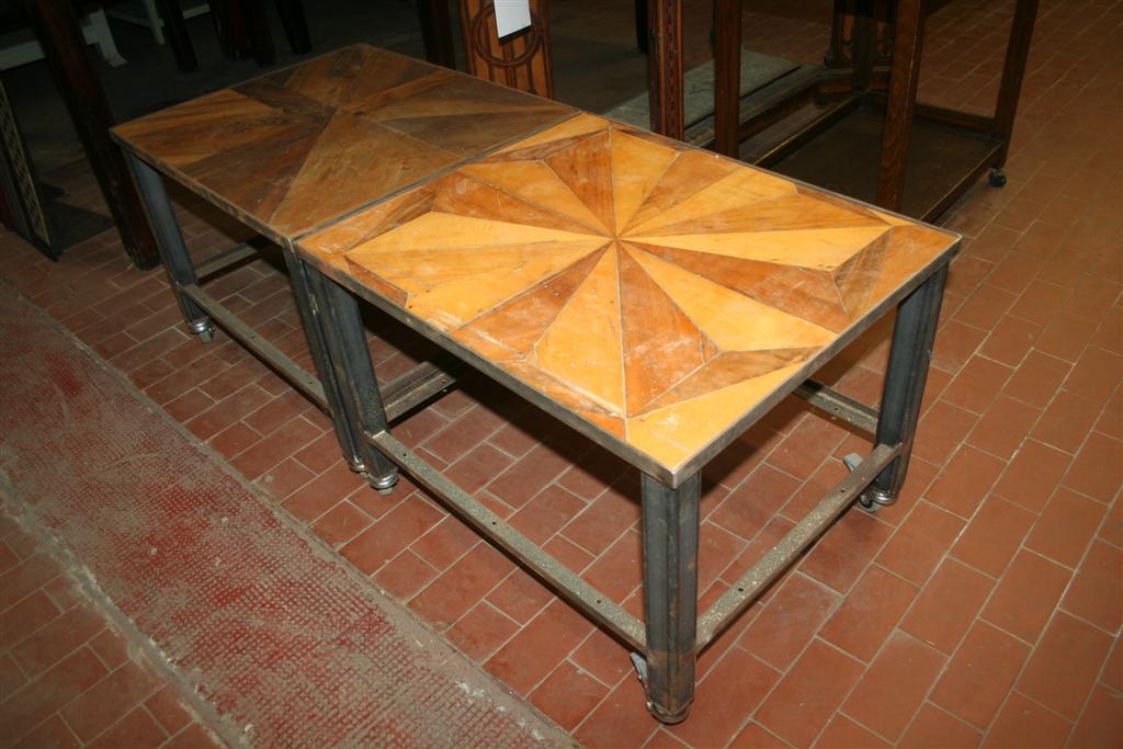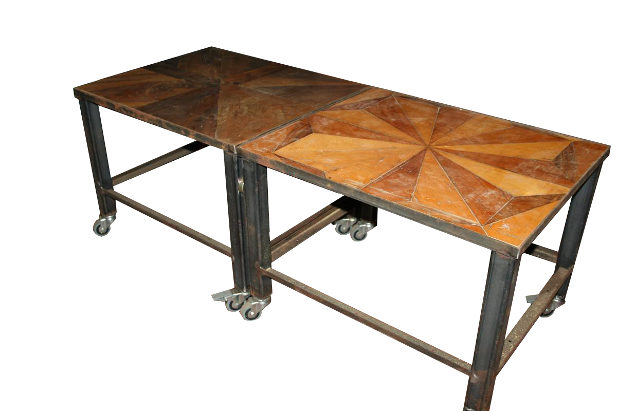 Coppia di tavolini da salotto in ferro, con piano creato con vecchie mattonelle di parquet originali dell'800. Provvisto di magneti per unire le due parti di cui è composto.