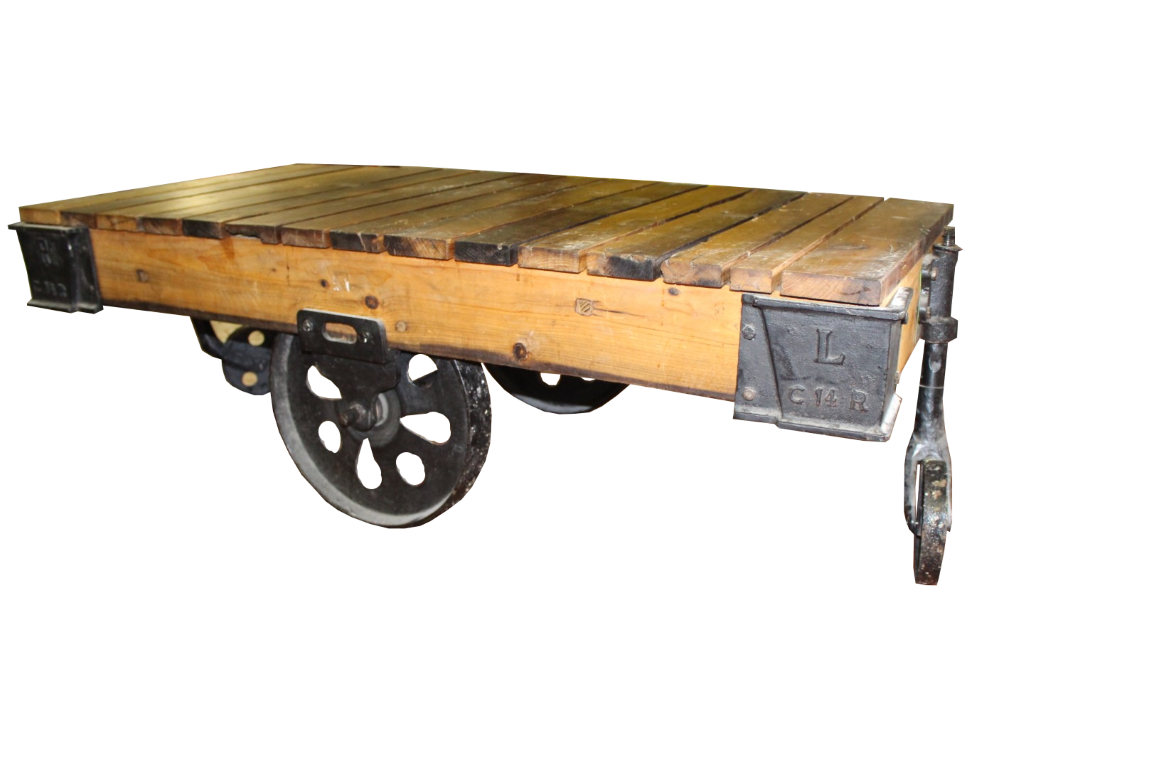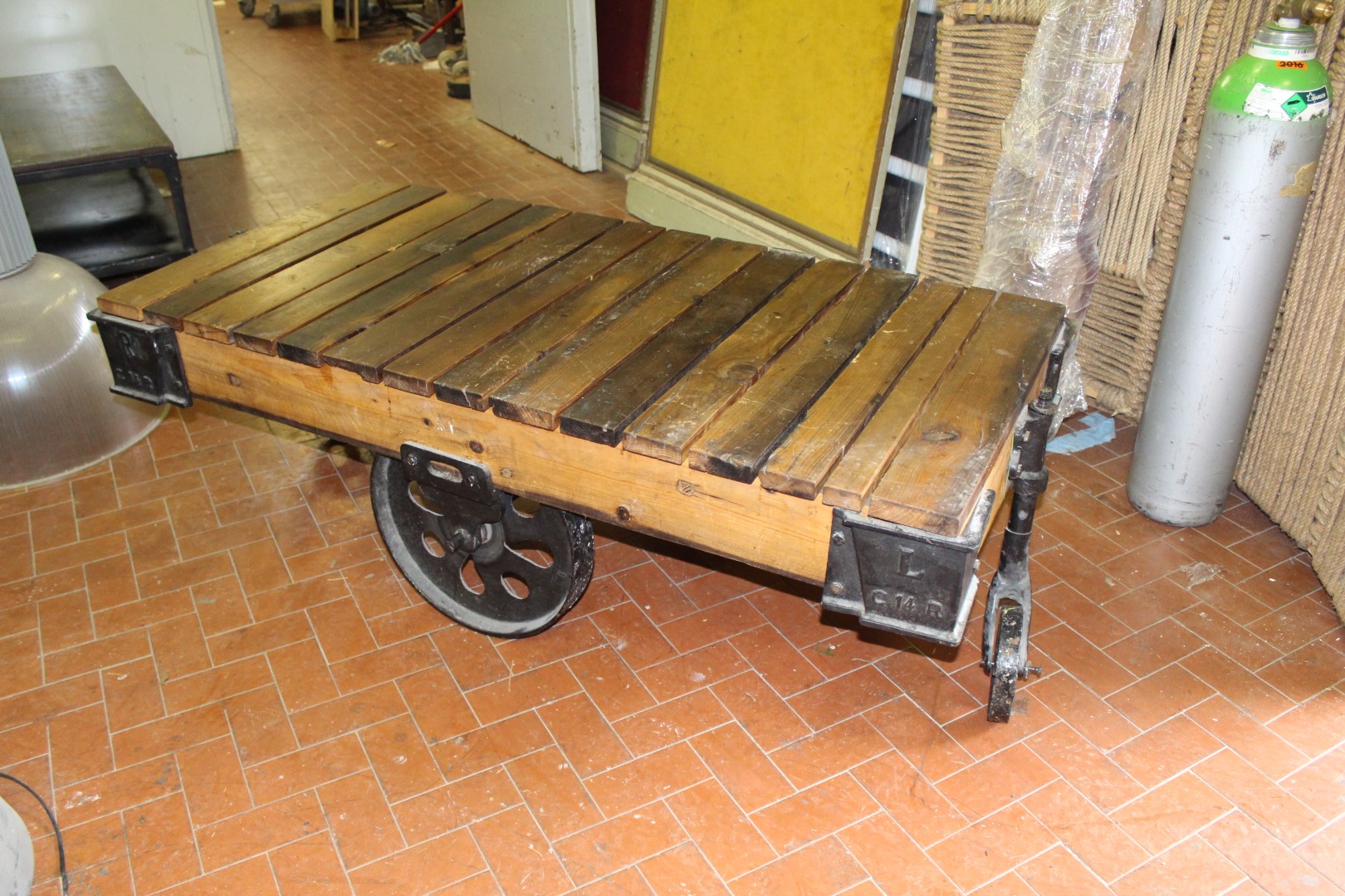 Coffeetable in ferro e legno, creato con un vecchio carrello industriale utilizzato per il trasporto di bagagli.