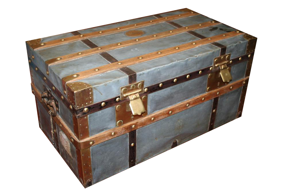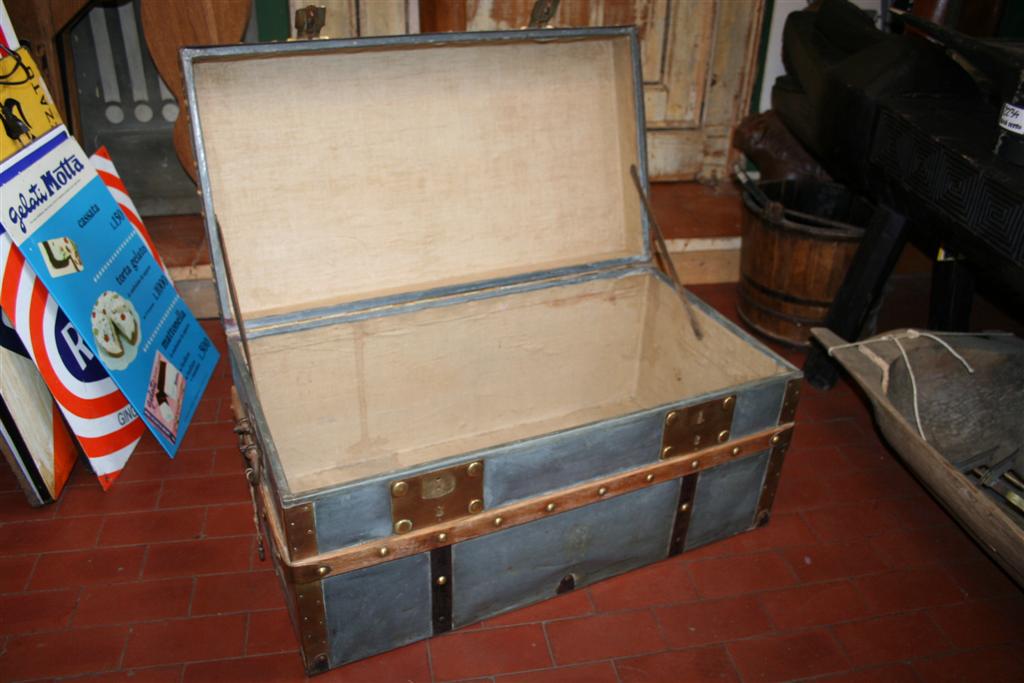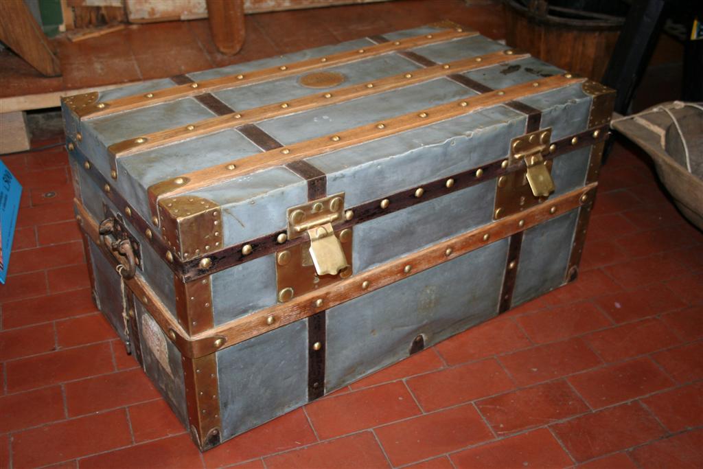 G&H Tatterton Best antique store Piccola malle cabine rivestita in zinco con doghe in rovere e finiture in ottone. L'interno è rivestito in tela. Su un fianco è dipinto il nome del primo proprietario V. Gaulin. Baule originale vintage francese anni '40.