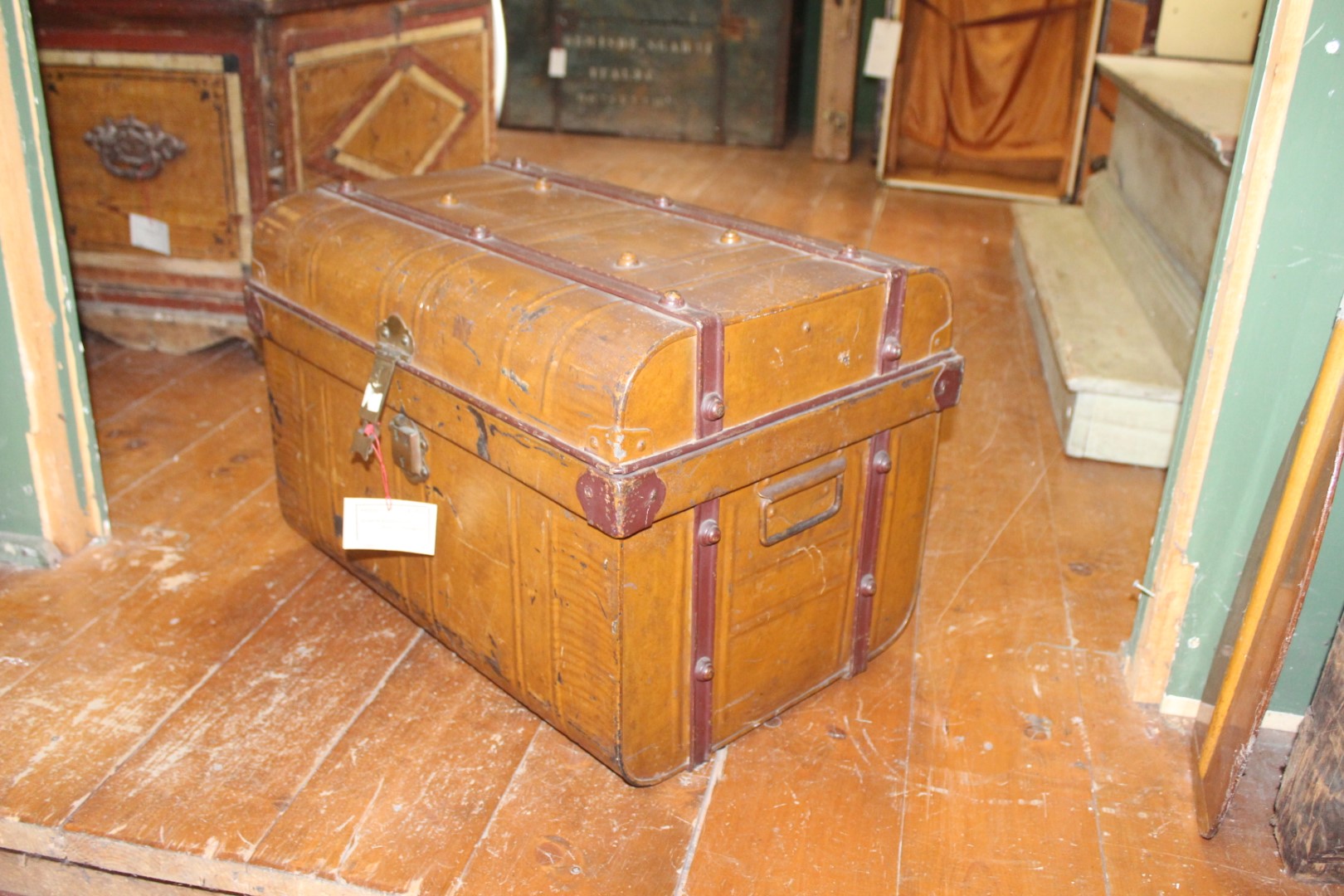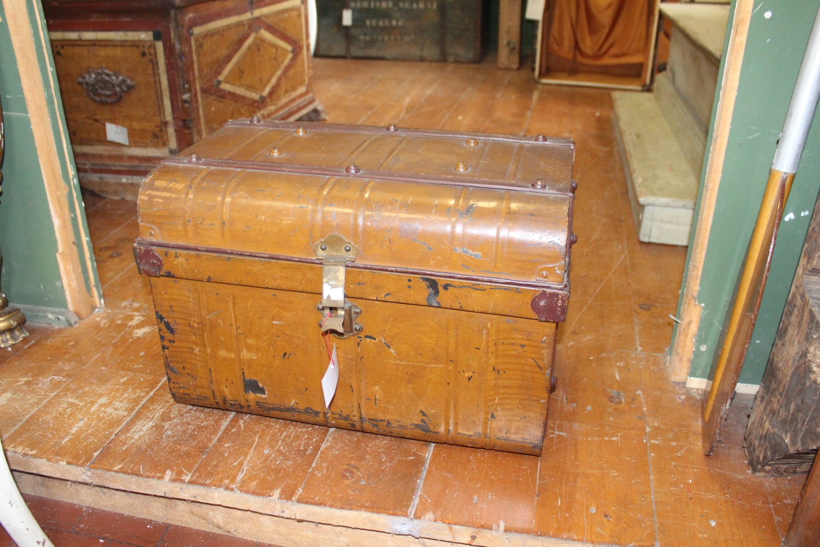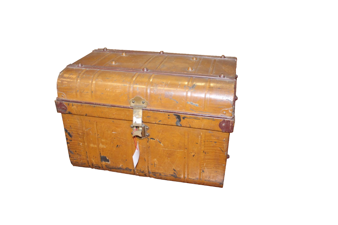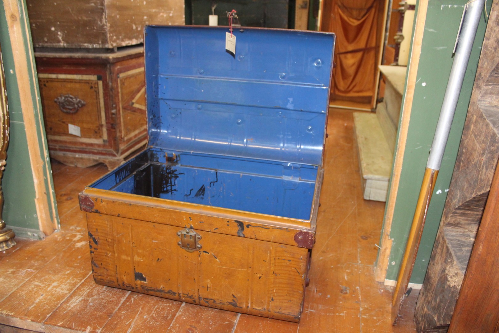 G&H Tatterton Best antique store Bauletto vintage in metallo color nocciola, con rifiniture metalliche in ottone e laccatura interna blu.