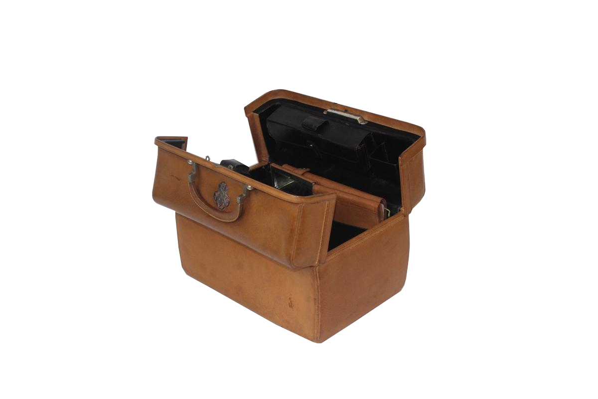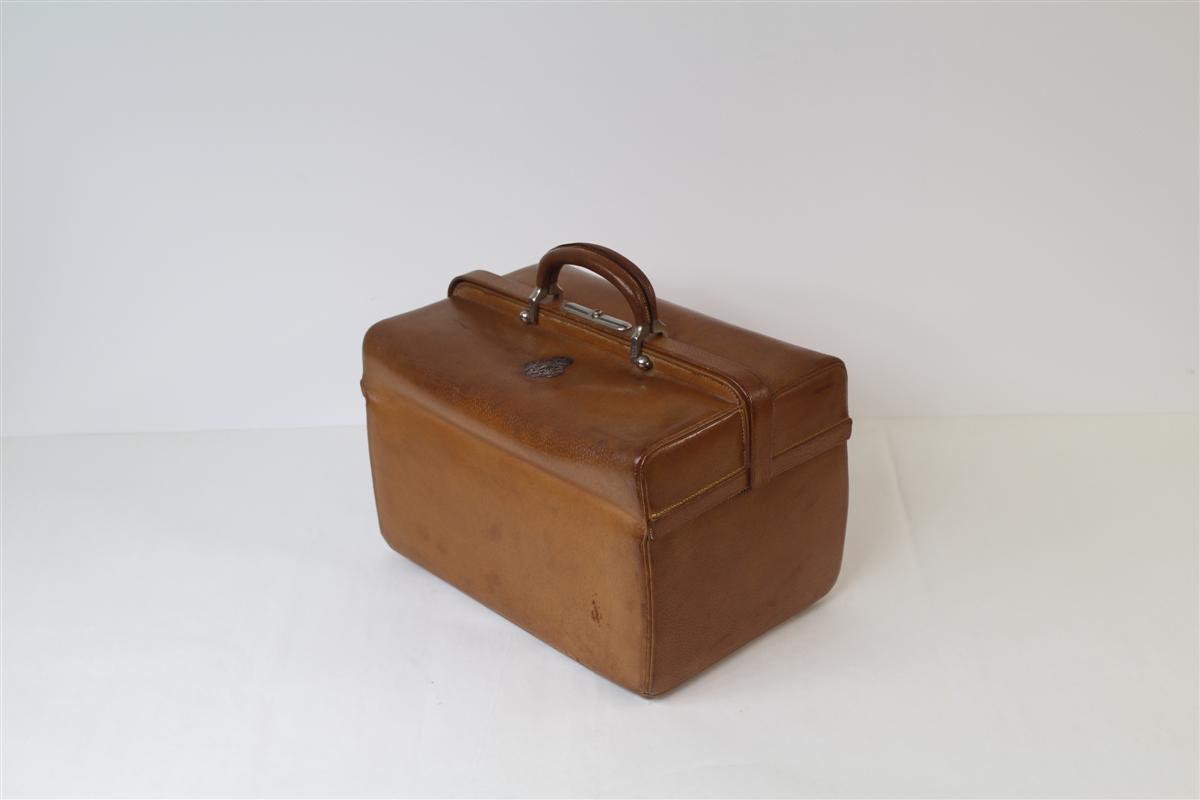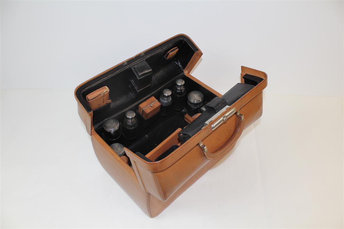 G&H Tatterton Best antique store Beauty case rivestito in pelle beige, completo di accessori da bagno e cosmetica, con finiture in argrento.