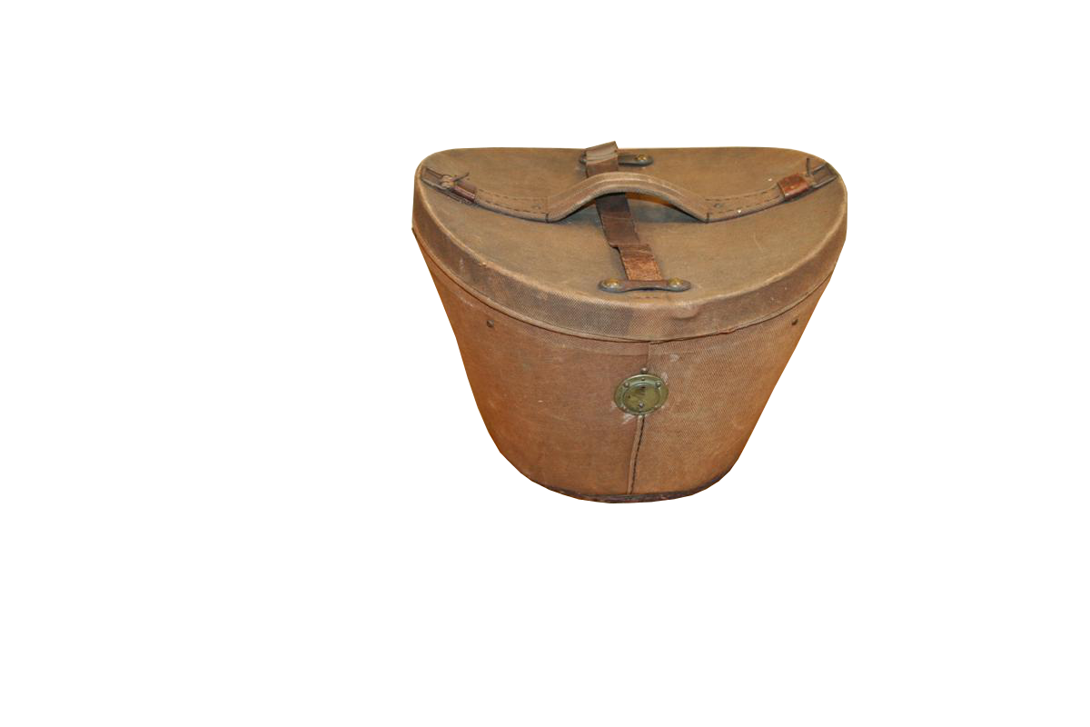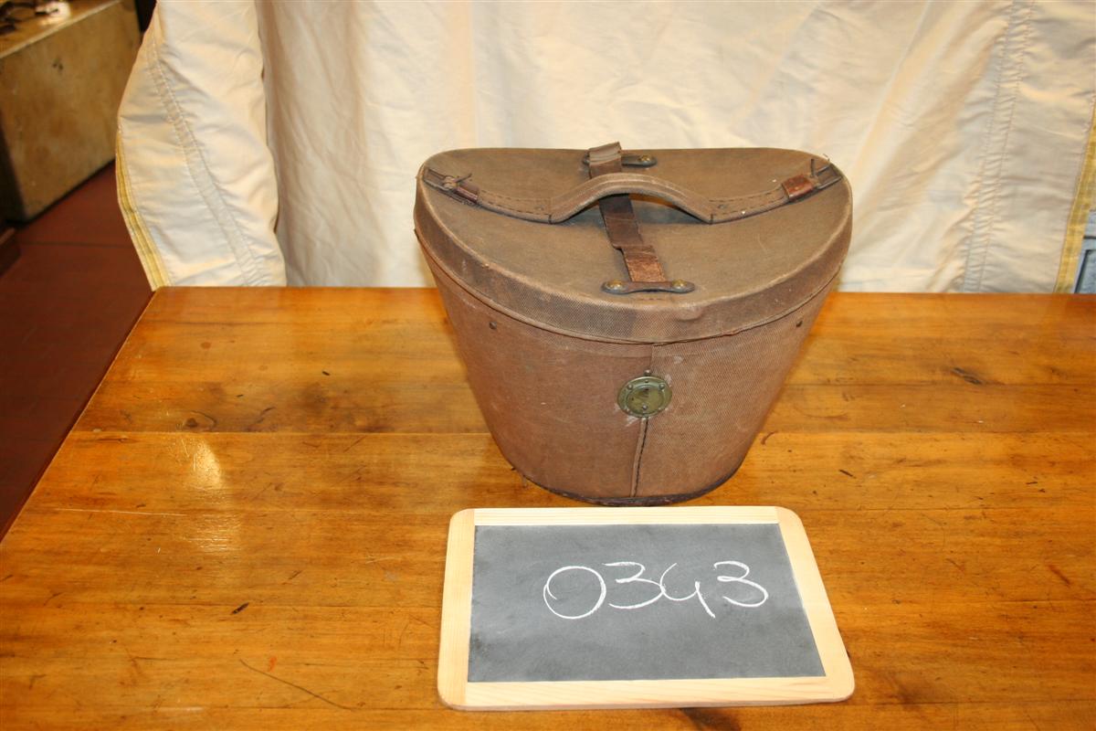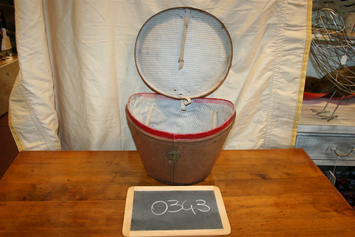 Cappeliera vintage in tela cerata marrone, con interno in stoffa a righe. Originale coloniale inglese anni '20.