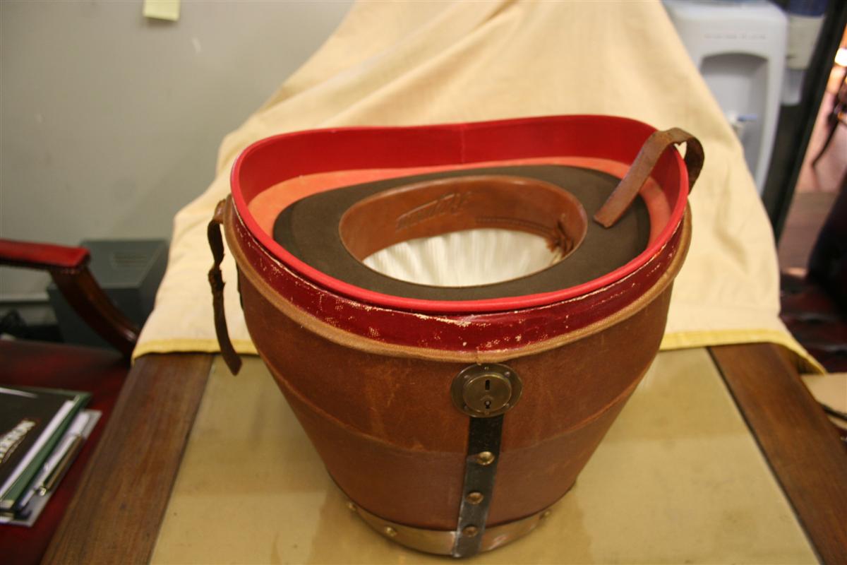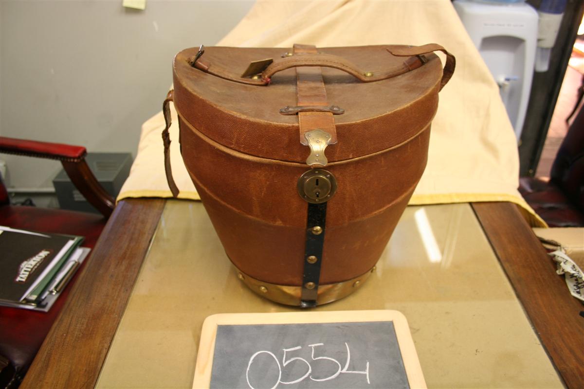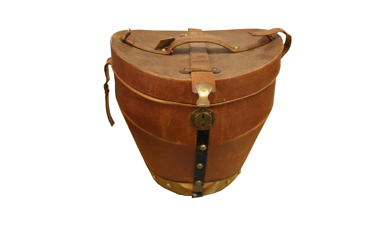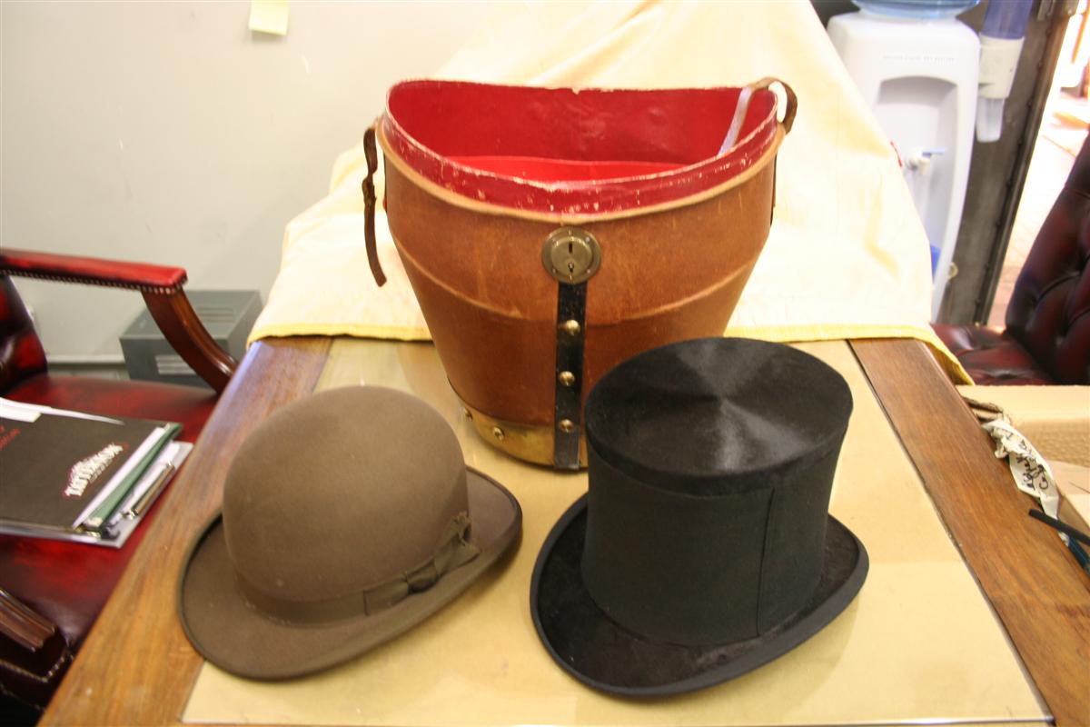 G&H Tatterton Best antique store Cappelliera vintage in tela marrone, con interno in pelle rossa. Completa di una bombetta in feltro marrone e un cilindro in cavallino nero. Originale coloniale inglese anni '20/'30.