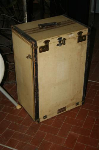 G&H Tatterton Best antique store Petit Malle Cabine, piccolo baule guardaroba verticale in tela cerata bianca, con interno rivestito in raso e dotato di appenderia verticale.