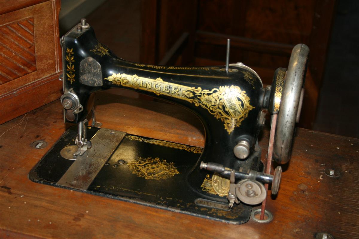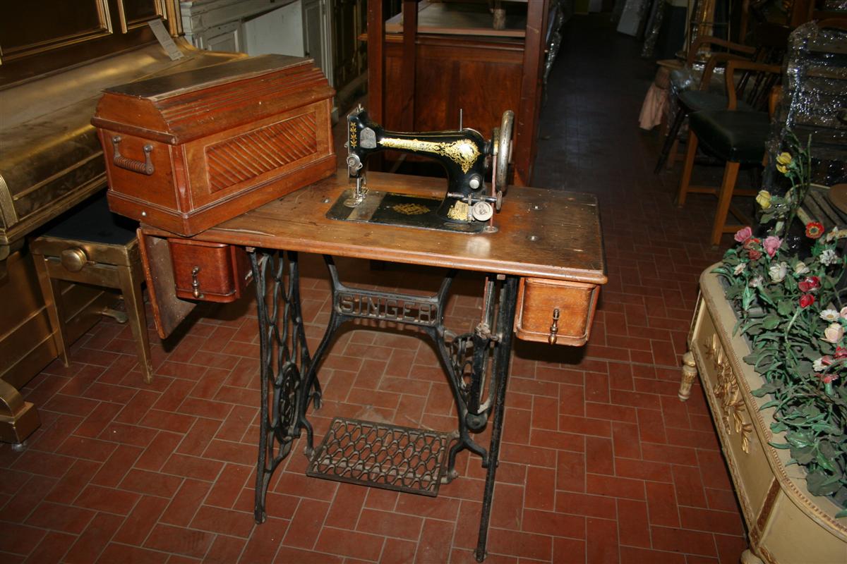 Macchina da cucire Singer, originale dei primi del '900, con cassettiera e coperchio in legno di quercia.