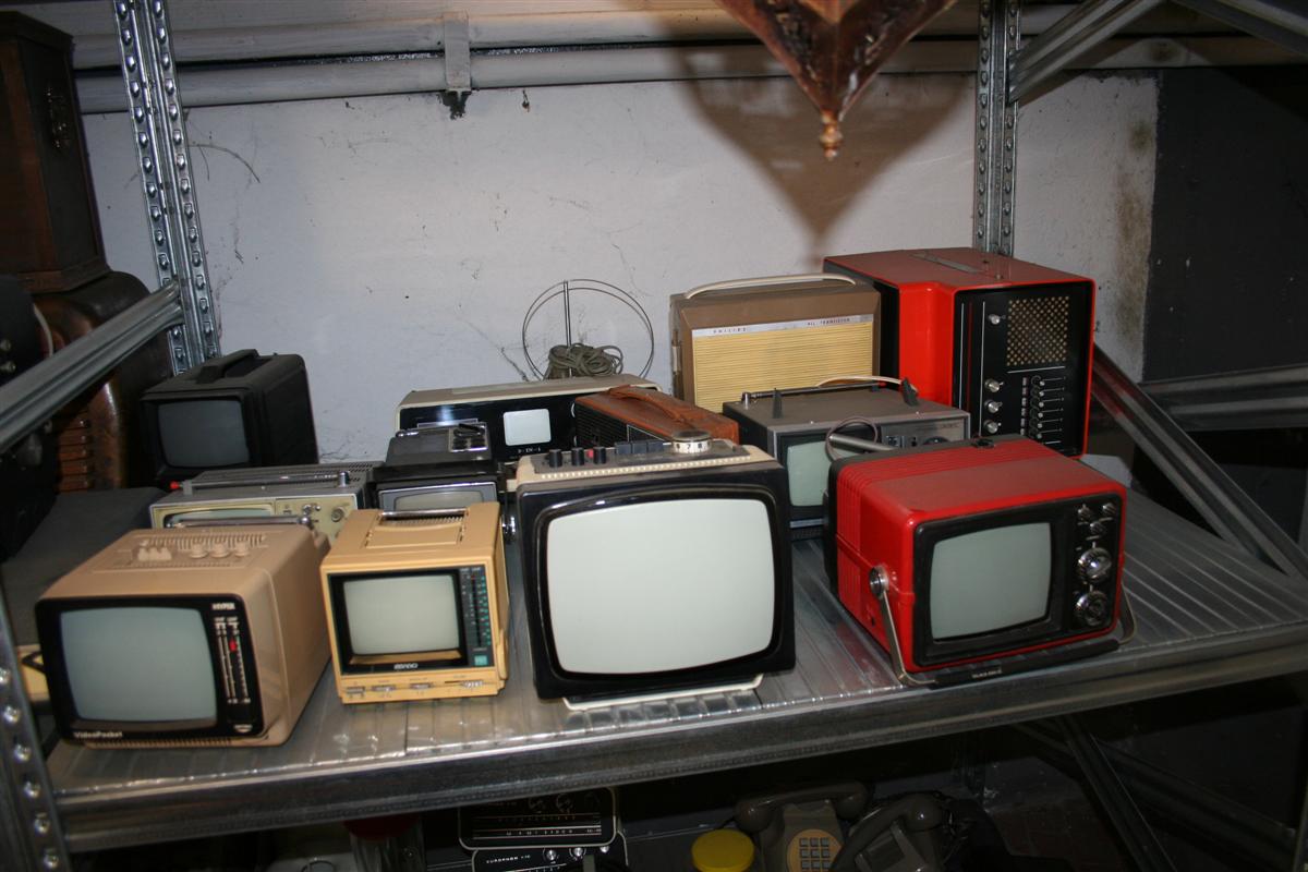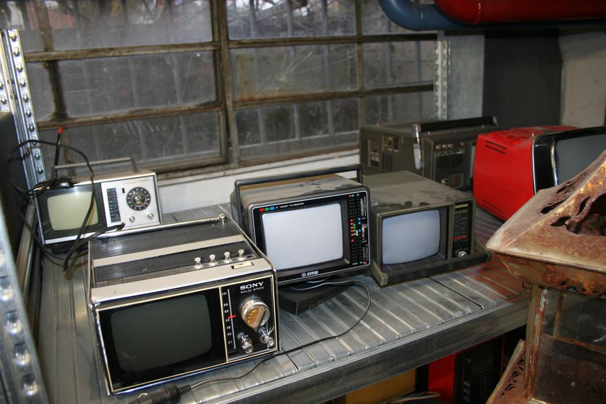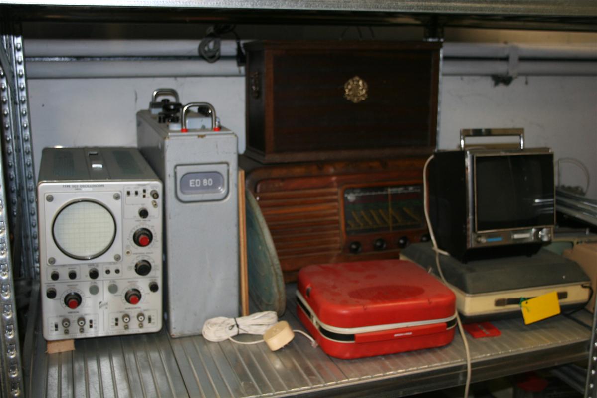 Attrezzatura varia audio-visivi vintage, tra cui vecchi televisori e vecchie radio portatili, oscilloscopi, accessori audio e varie.
