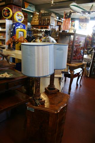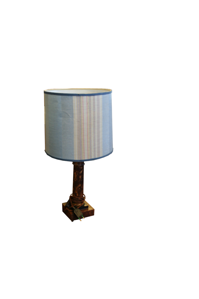 Coppia di lampade about jour, in legno dipinto marmorizzato e paralume azzurro.