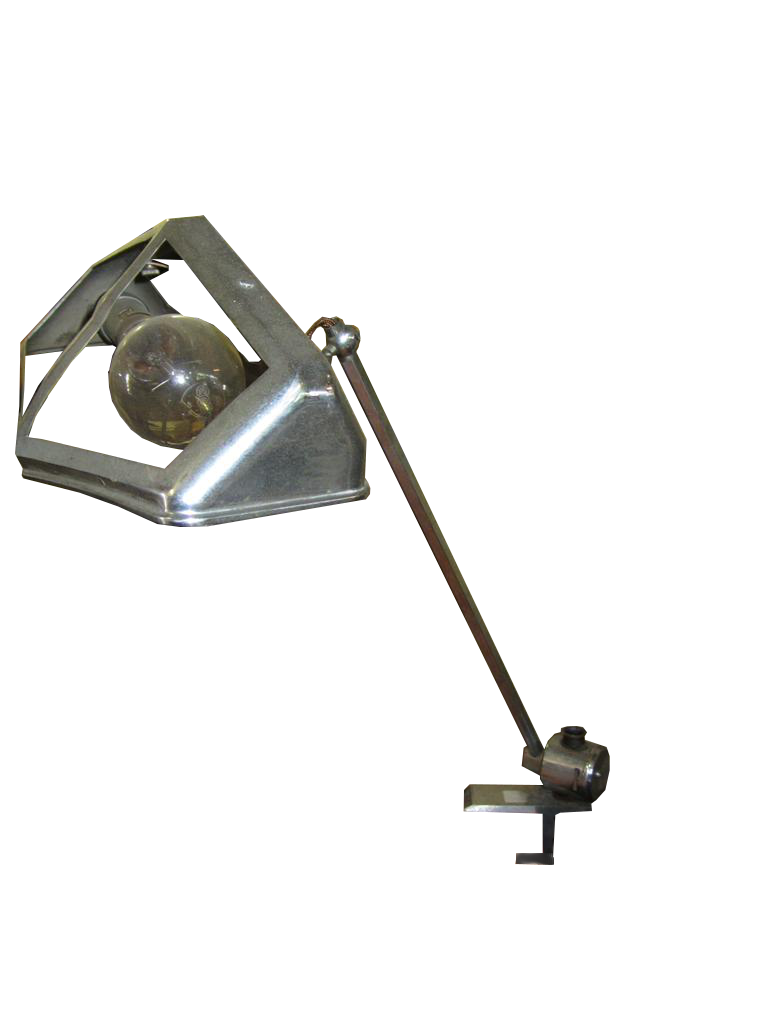 Lampada da tavolo Decò in ottone cromato con fissaggio a morsetto.