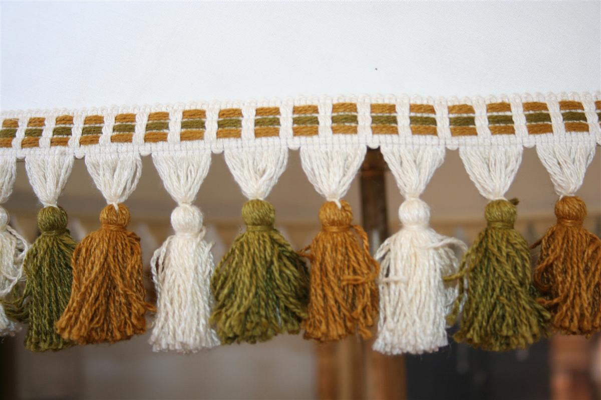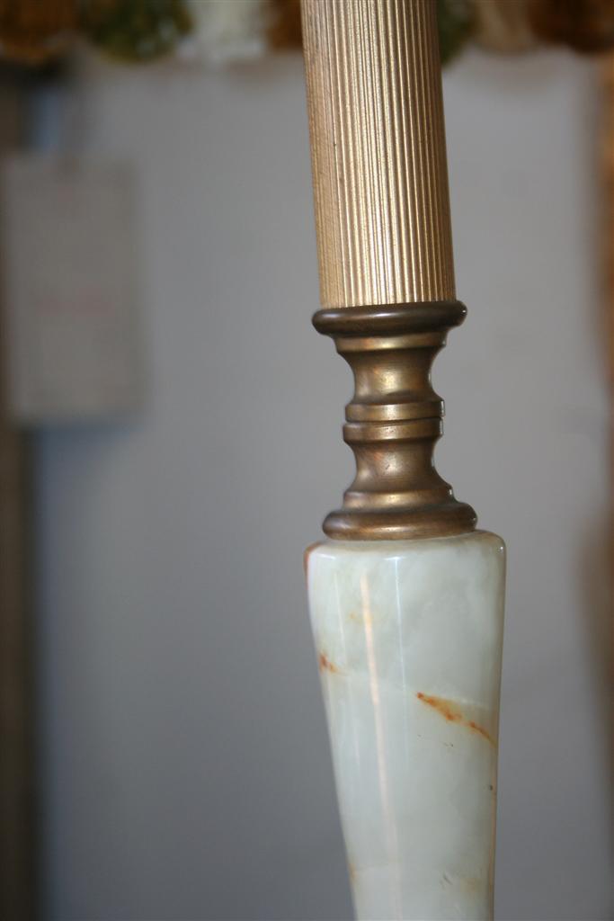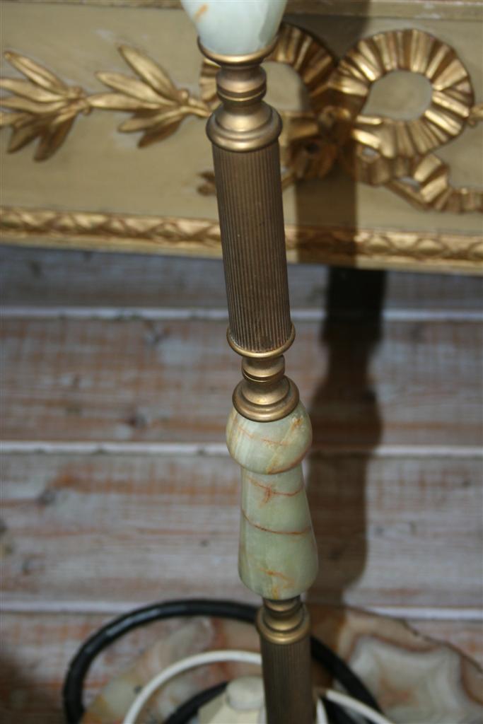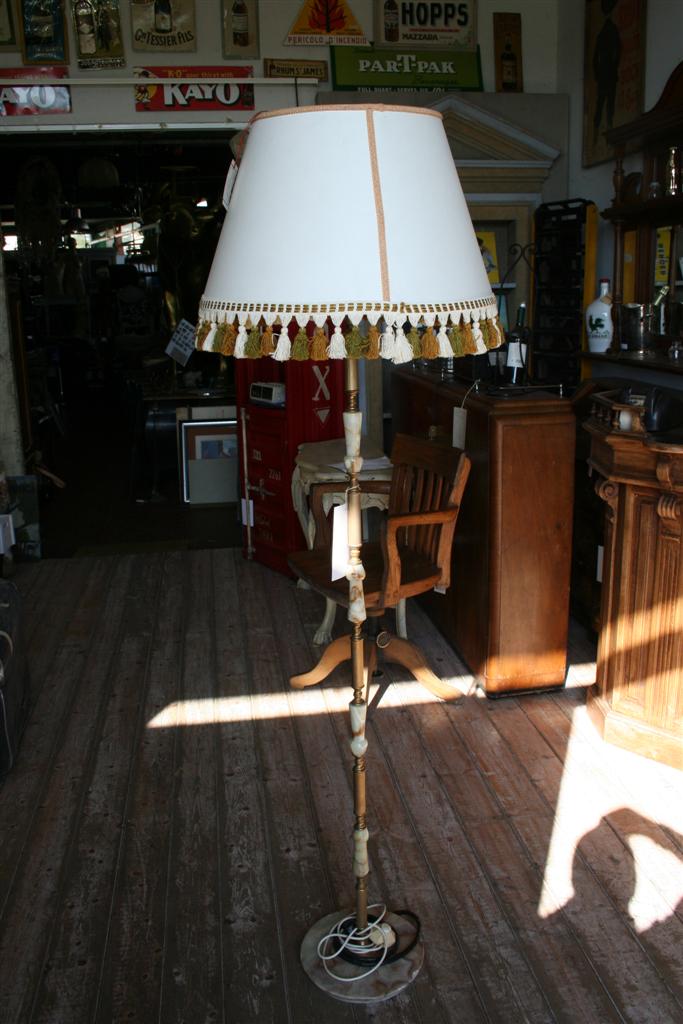 Lampada a stelo vintage in ottone ed onice,cappello con frappe, anni '50.