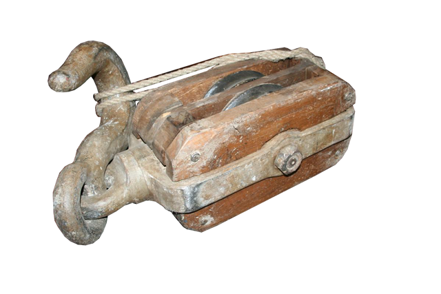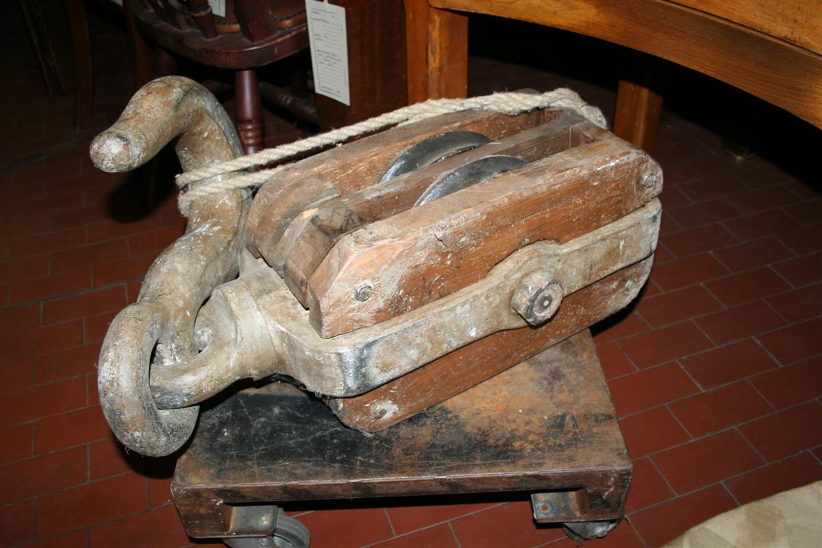 Gancio, bozzello gigante in legno e ferro con doppia carrucola.