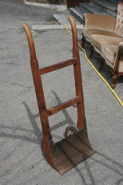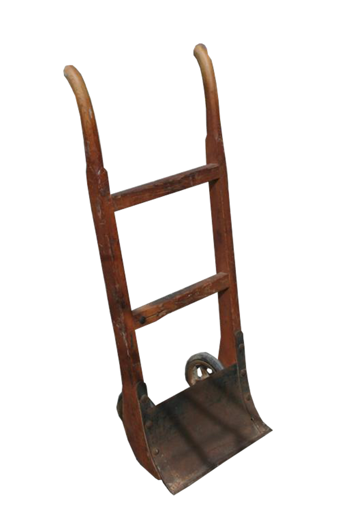 Carrello da mugnaio rustico a due ruote, in ferro e legno.