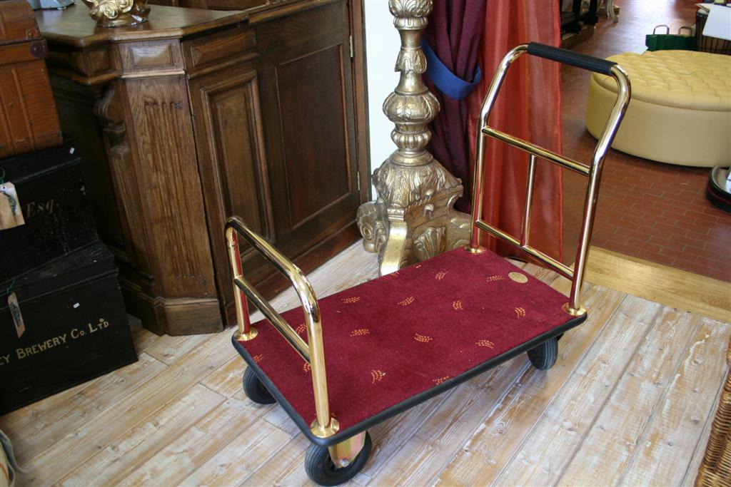 Carrello portavaligie da hotel in ottone con velluto rosso, modello basso.