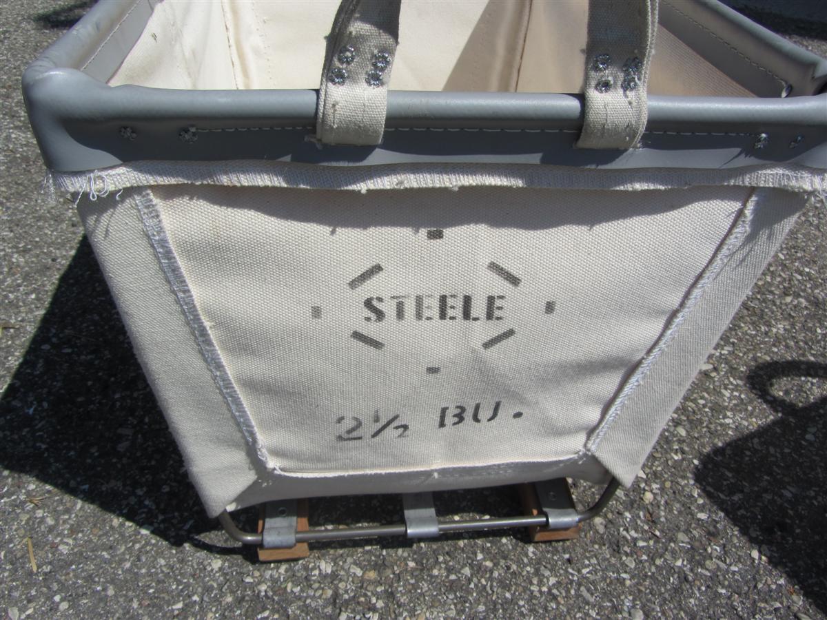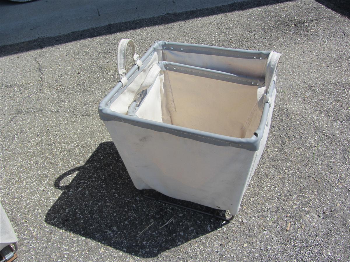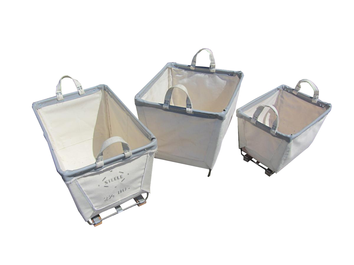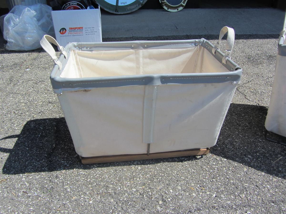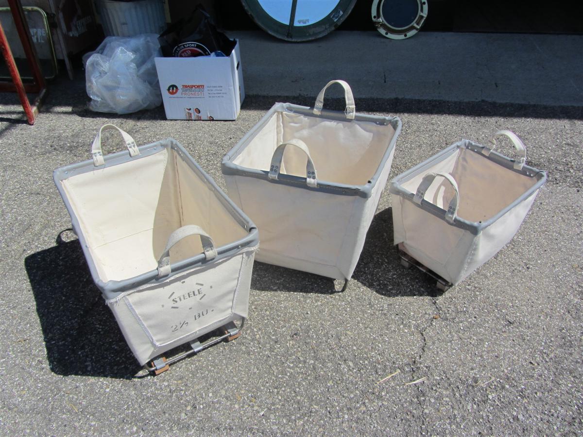 Cesti portabiancheria in stoffa con struttura e manici in ferro.