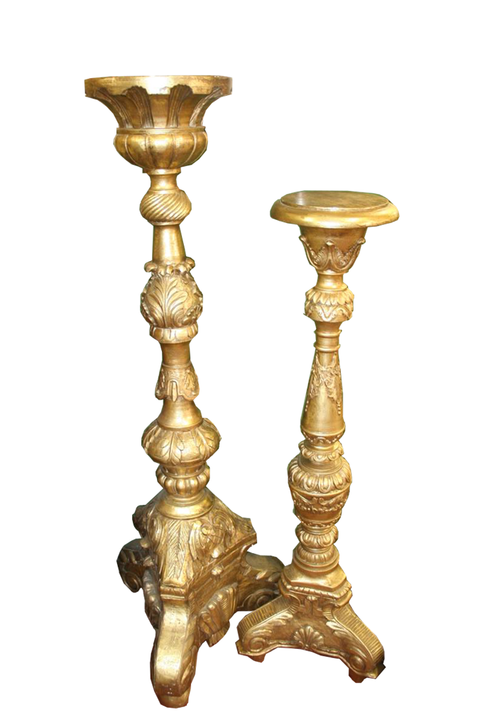 Riproduzione di candelabro francese in legno dorato, con fiori e decori ad intarsio. Modello alto.