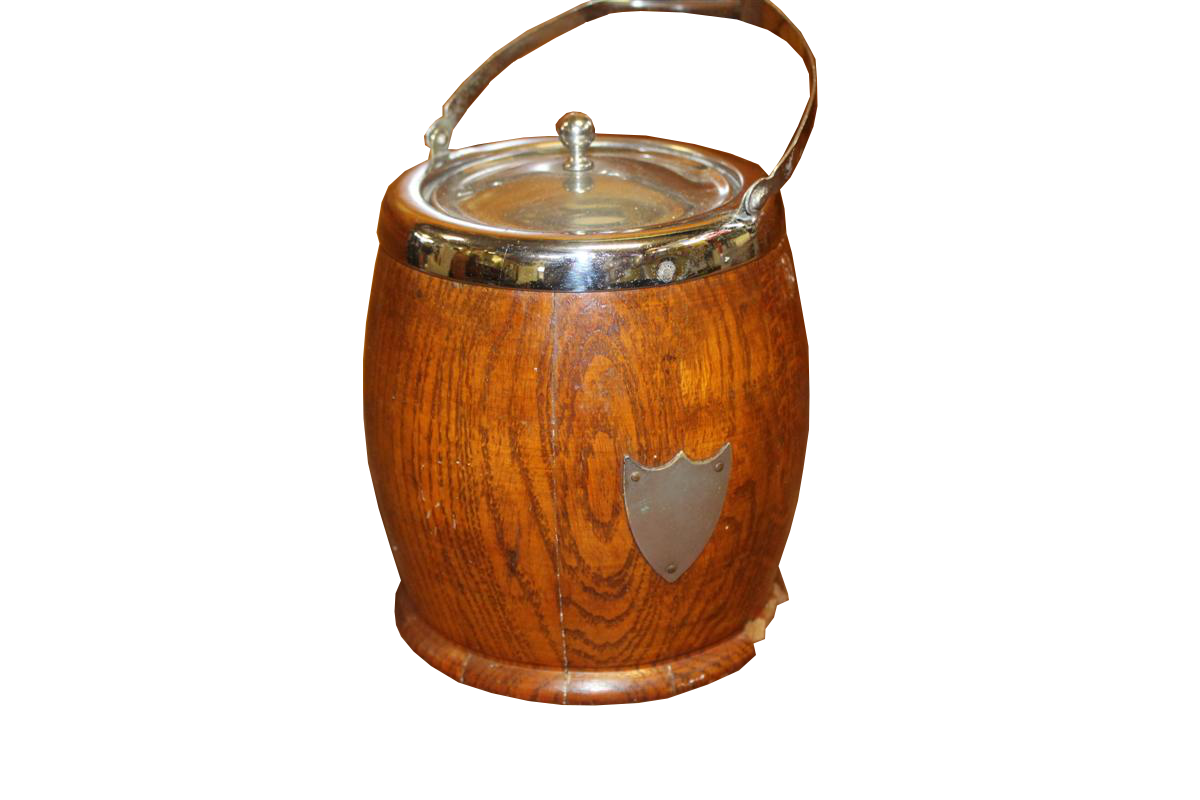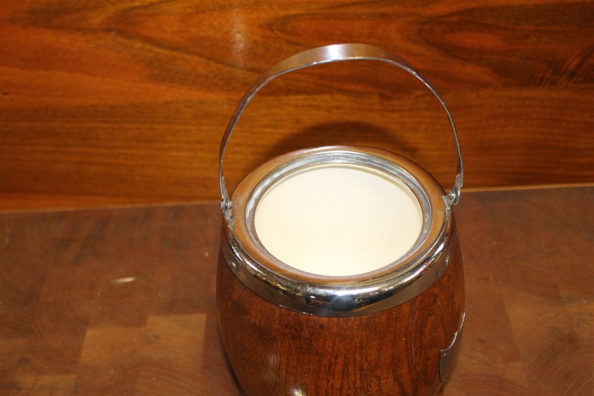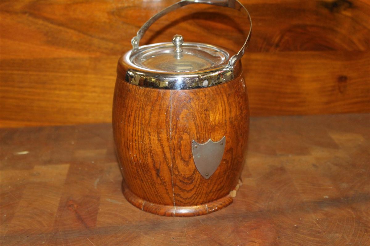 Scatola portabiscotti in legno anni '40.Con vaso interno in ceramica, manico e coperchio in metallo.