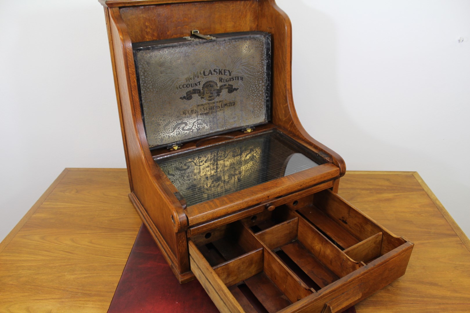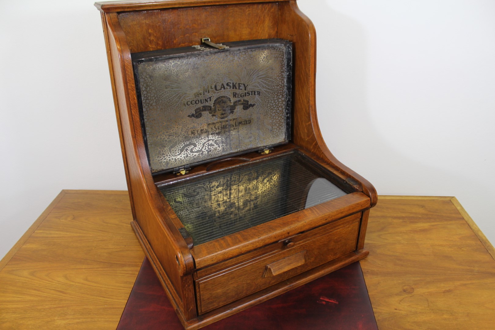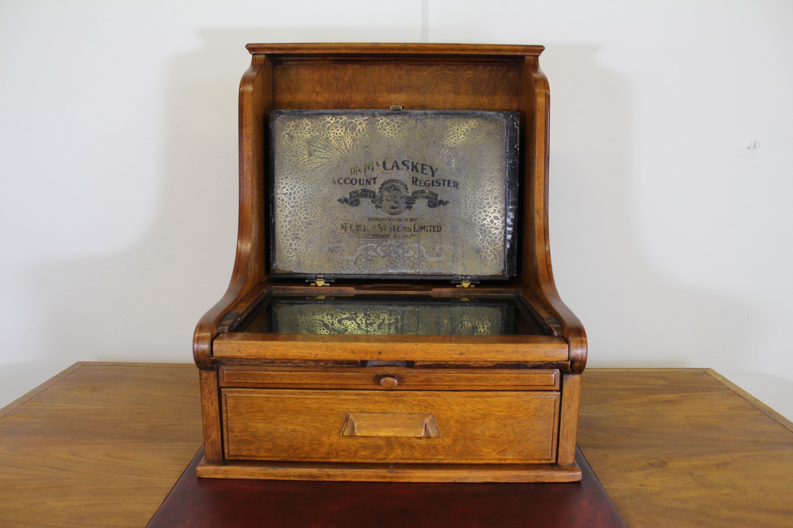 G&H Tatterton Best antique store The McCaskey Account Register, Registratore di cassa per prenotazioni da ristorante o albergo in rovere e metallo. Dispone di due cassetti utilizzati per i soldi e di due pannelli in metallo per prenotazioni e ordini.