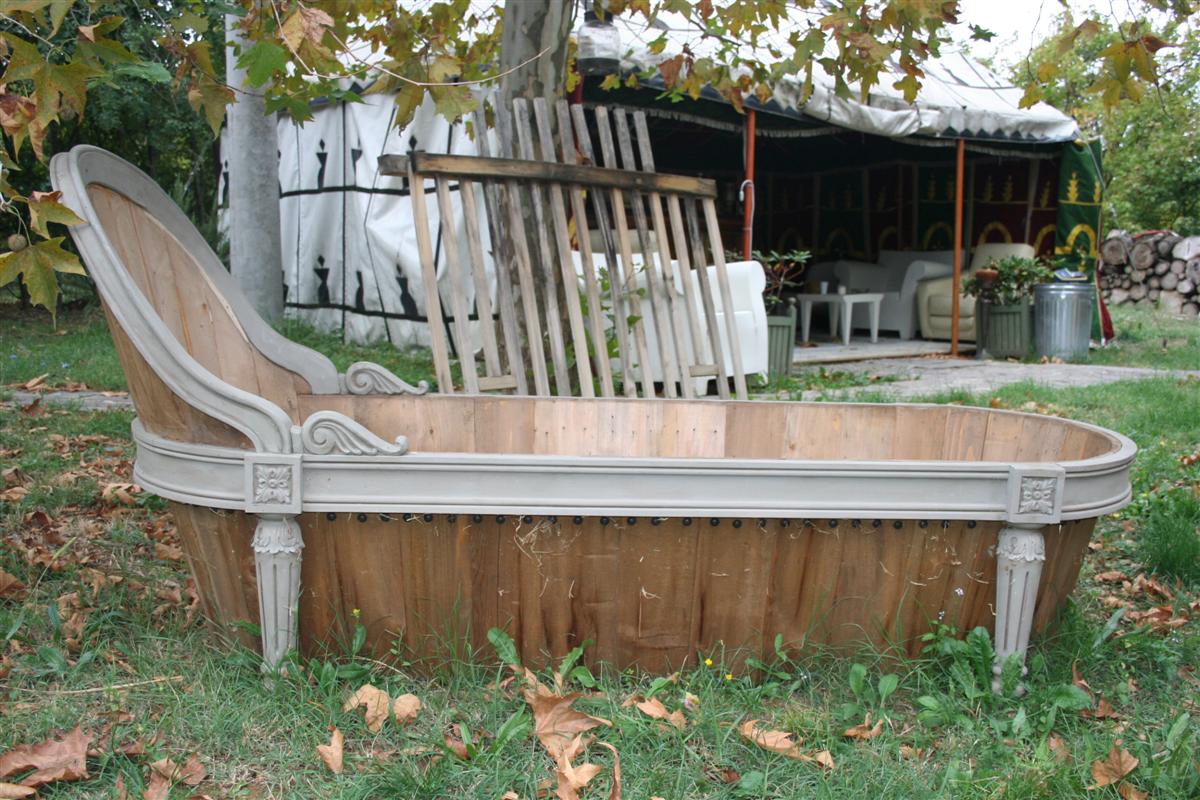 Vasca in legno scenografica con schienale alto e seduta.