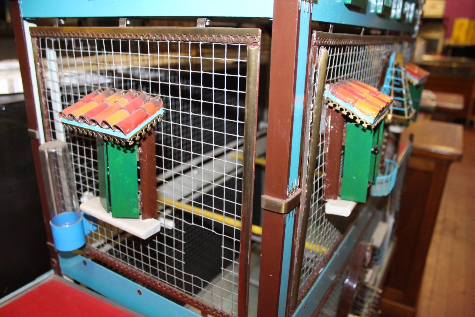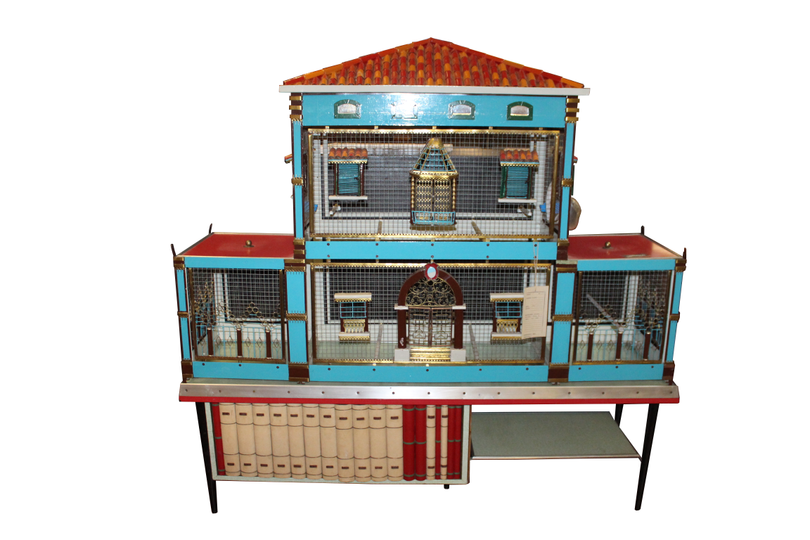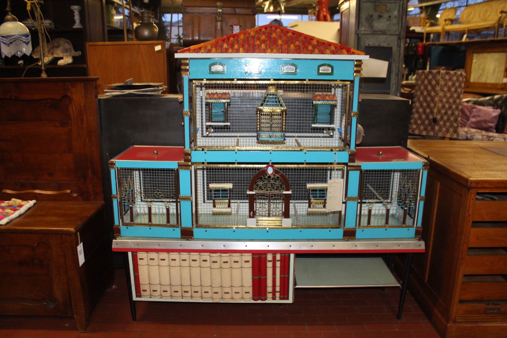 G&H Tatterton Best antique store Voliera artigianele anni '50, casetta per uccelli artigianale, a forma di castello, poggiata su mobiletto a doppia anta concamouflage esposizione di libri.