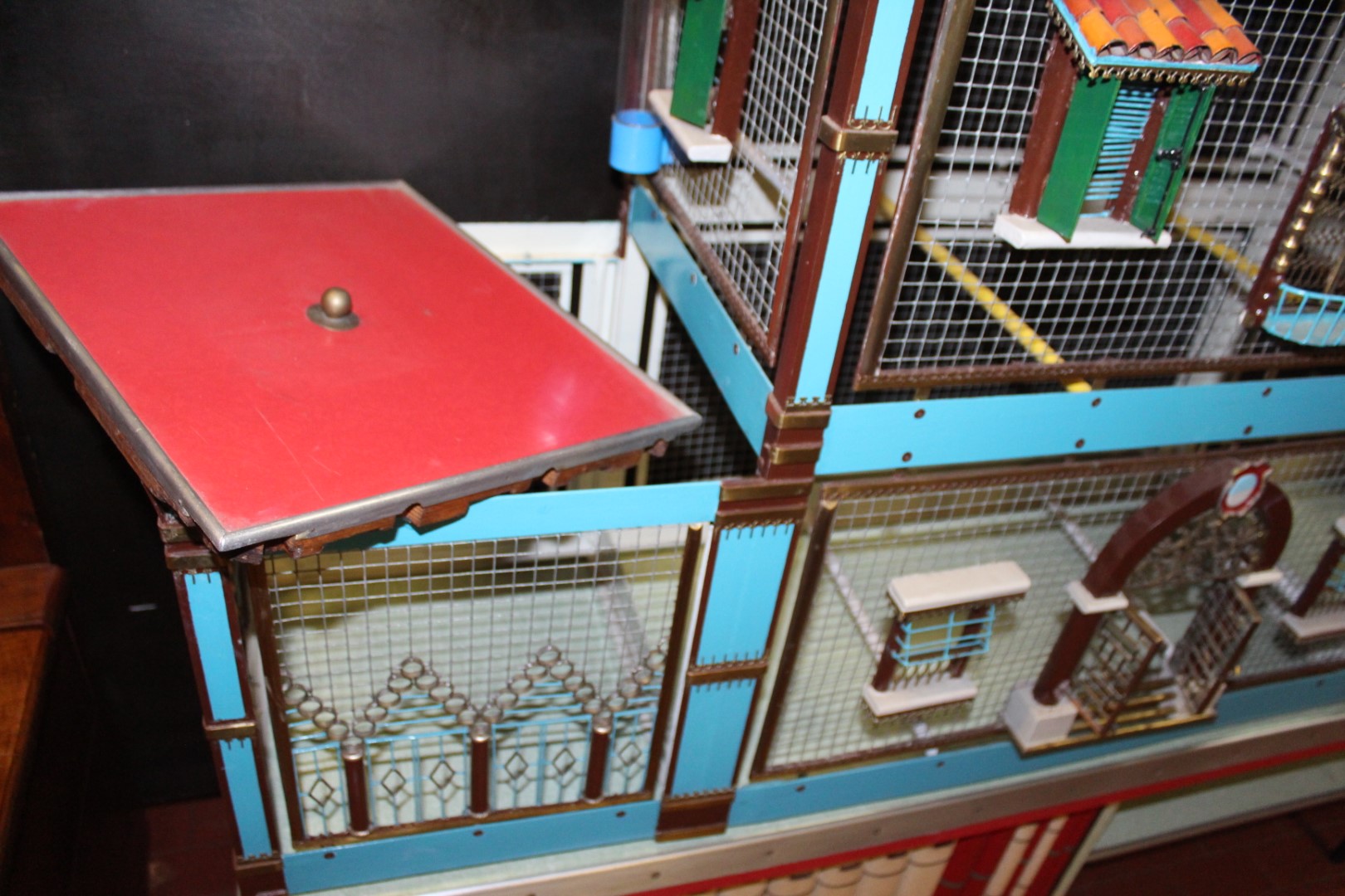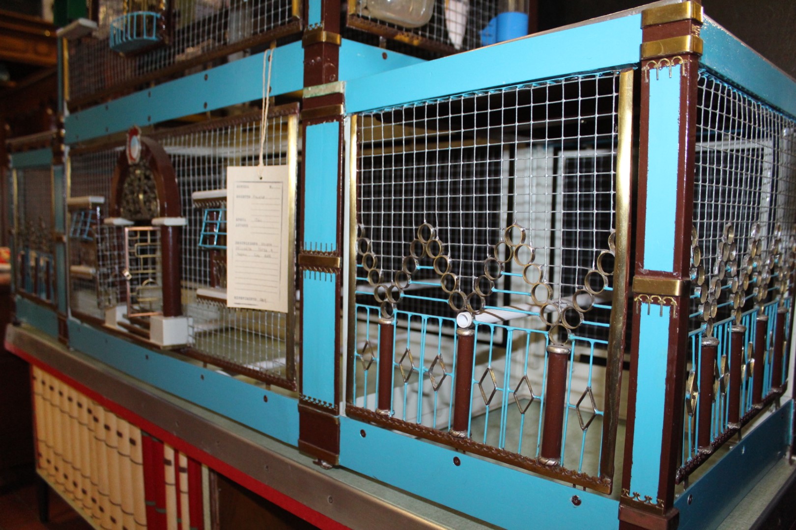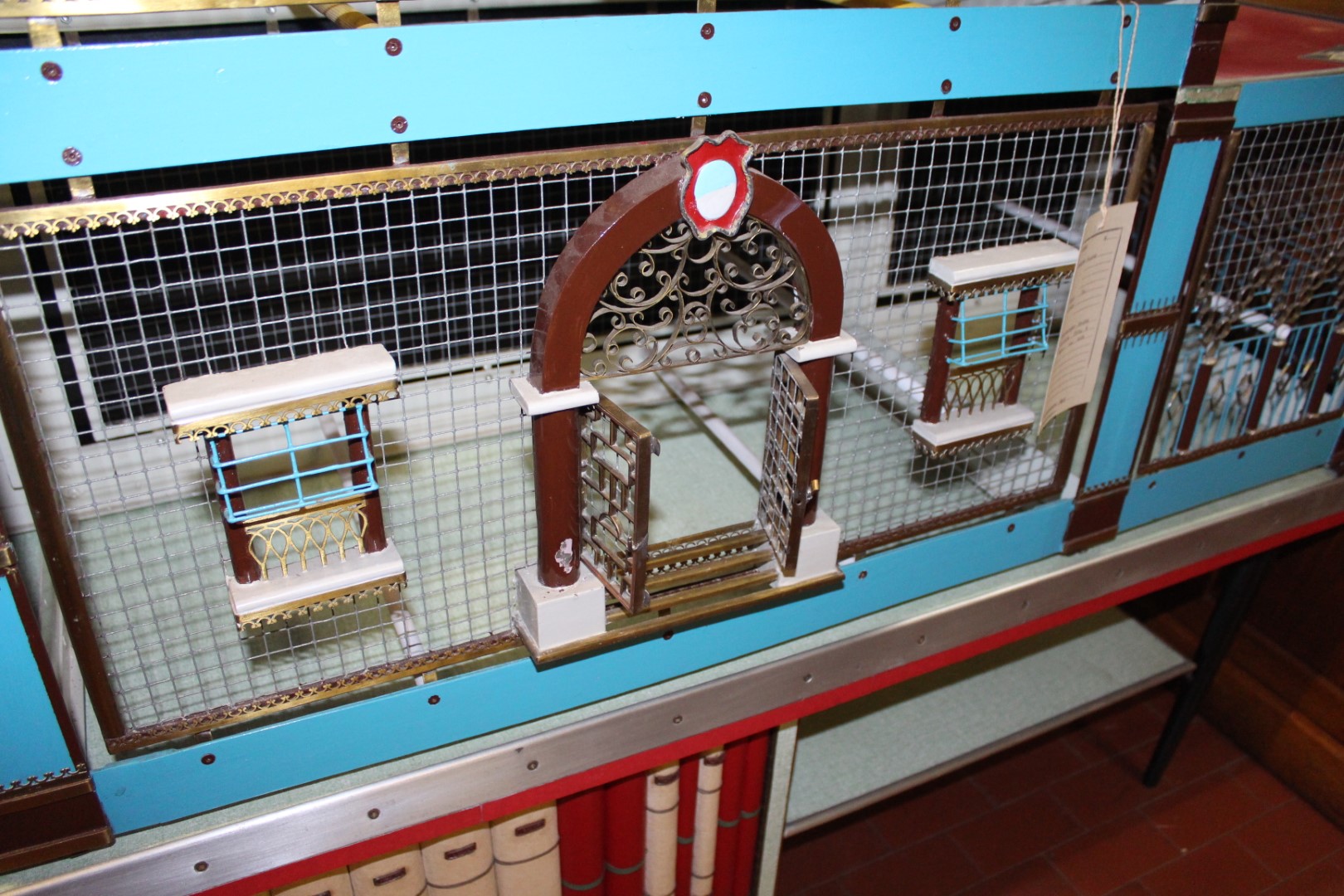 G&H Tatterton Best antique store Voliera artigianele anni '50, casetta per uccelli artigianale, a forma di castello, poggiata su mobiletto a doppia anta concamouflage esposizione di libri.