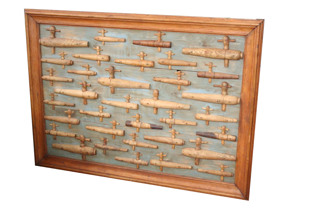 Pannello in legno con collezione di tappi di botti originali dei primi del '900..