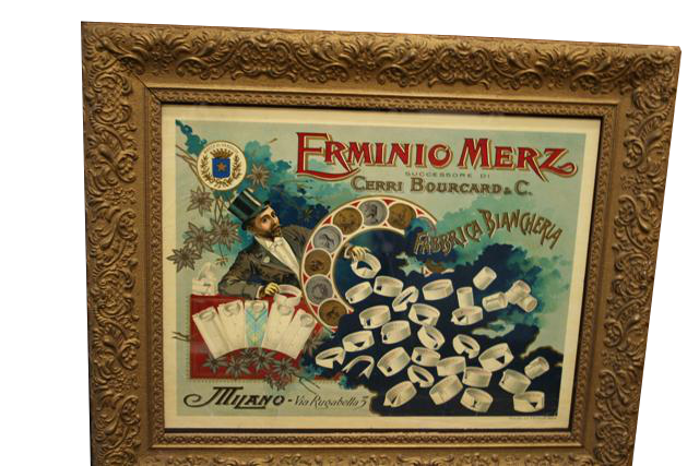 Cromolitografia pubblicitaria originale Erminio Merz, Fabbrica di biancheria, Milano, 1890 circa.