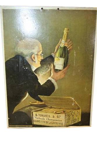 Cromolitografia pubblicitaria su cartone Tessier, casa produttrice di champagne francese.