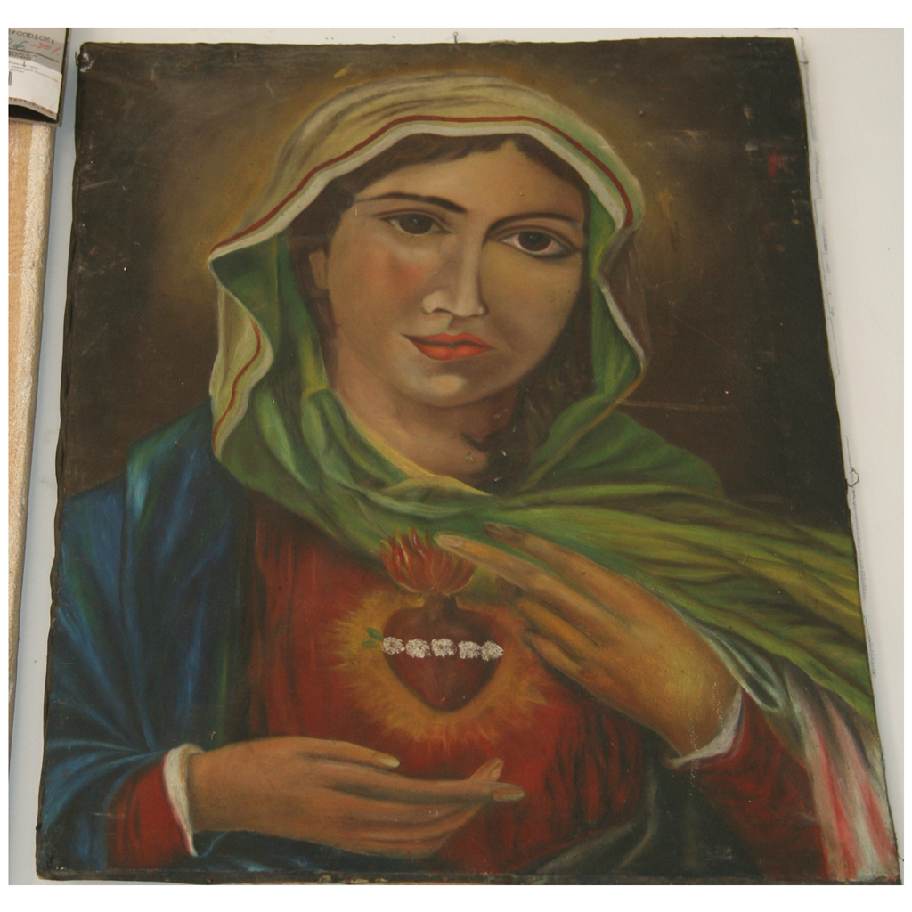 Quadro ad olio su tela raffigurante una madonna con cuore.