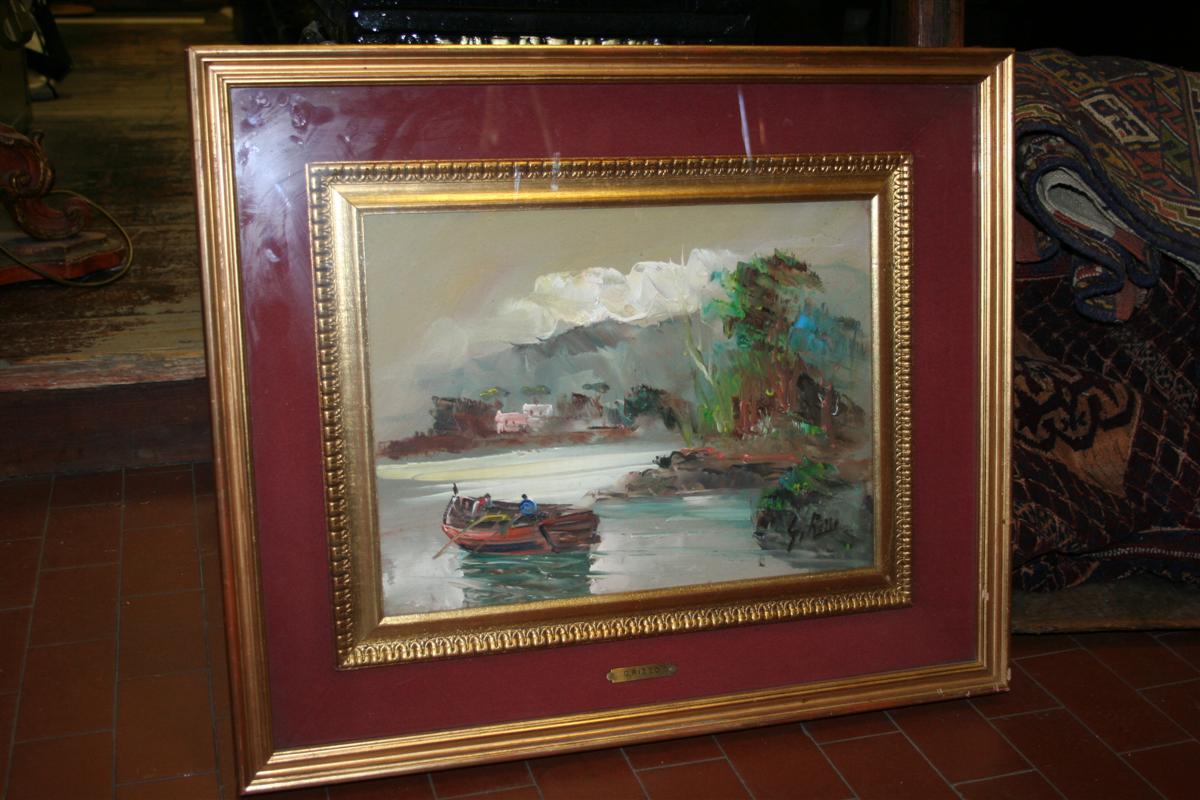 Quadro ad olio su tela, a soggetto paesaggio marittimo, con cornice oro. Firmato G.Rizzo