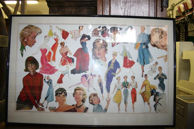 Quadro sartoriale vintage a china di modelli sartoriali da donna. Originale francese anni '40.